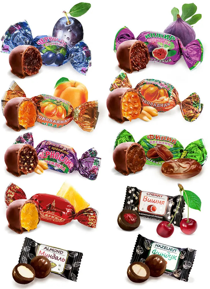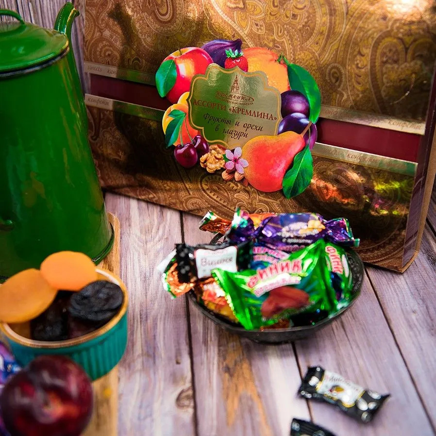 Кремлина Набор конфет ассорти «Фрукты и орехи в глазури»В данный момент этот товар отсутствует в продаже. Возможно, у нас найдется аналогичный или похожий товар здесь. Конфеты Кремлина — ассорти из фруктов и орехов в глазури: чернослив, чернослив с арахисом, курага, курага с арахисом, финик, инжир, вишня, миндаль, фундук, ананас. Содержит много полезных витаминов и микроэлементов. Для производства используются натуральные ингредиенты высшего качества. Конфеты отлично подойдут как в качестве самостоятельной сладости, которую можно употребить на перекусе, так и в качестве дополнения к чаепитию. Их рекомендуется есть с чаем, кофе, какао. Такие конфеты содержат в себе глюкозу, которая, в свою очередь, является хорошим источником энергии, насыщая мозг, мышцы и внутренние органы. Также сладость поднимает настроение, поскольку способствует выработке эндорфина — гормона счастья. Конфеты понравятся как взрослым, так и детям. Помимо этого, конфетки часто используются в качестве подарка или знака внимания. Они являются универсальным способом выразить свою заботу и внимание к близким людям. Также такие кондитерские изделия могут стать основой для создания уникальных десертов и украшений для тортов и пирожных. |