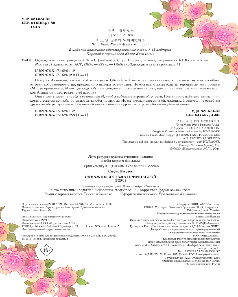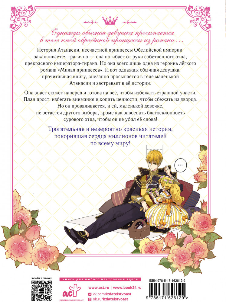 💳 Оплатить за товар можно при получении 🇰🇿 Есть бесплатная доставка по Казахстану 🎁 Копите бонусы с каждой покупки Серия: Вебтун. Однажды я стала принцессой История Атанасии, несчастной принцессы Обелийской империи, заканчивается трагично — она погибает от руки собственного отца, прекрасного императора-тирана. Но она всего лишь одна из героинь лёгкого романа «Милая принцесса». И вот однажды обычная девушка, прочитавшая книгу, внезапно просыпается в теле маленькой Атанасии и застревает в её истории. Она знает сюжет наперёд и готова на всё, чтобы избежать страшной участи. План прост: избегать внимания и копить ценности, чтобы сбежать из дворца. Но он проваливается, и ей, маленькой девочке, не остаётся другого выбора, кроме как завоевать благосклонность сурового отца, чтобы он не убил её снова! |