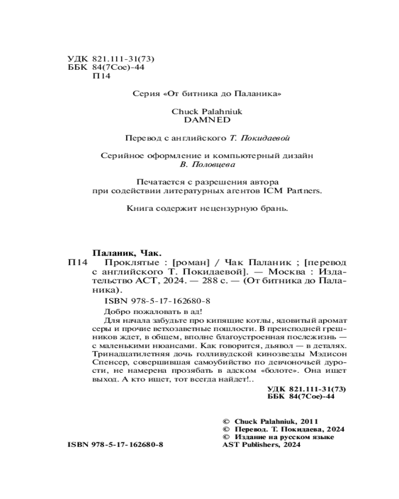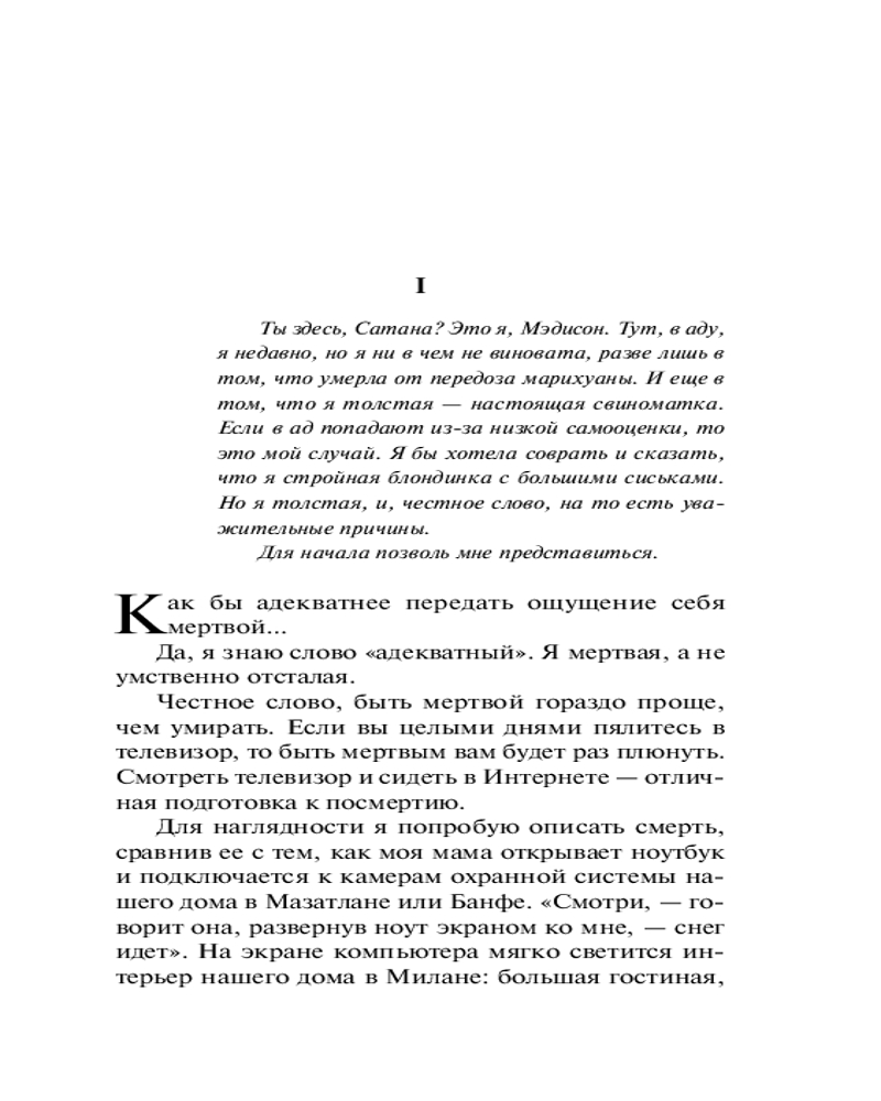 💳 Оплатить за товар можно при получении 🇰🇿 Есть бесплатная доставка по Казахстану от 1 дня 🎁 Копите бонусы с каждой покупки Серия: От битника до Паланика Добро пожаловать в ад! Для начала, забудьте про кипящие котлы, ядовитый аромат серы и прочие ветхозаветные пошлости. В преисподней грешников ждет, в общем, вполне благоустроенная послежизнь — с маленькими нюансами. Как говорится, дьявол — в деталях. Тринадцатилетняя дочь голливудской кинозвезды Мэдисон Спенсер, совершившая самоубийство по девчоночьей дурости, не намерена прозябать в адском «болоте». Она ищет выход. А кто ищет, тот всегда найдет!.. |