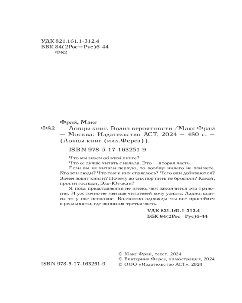 💳 Оплатить за товар можно при получении 🇰🇿 Есть бесплатная доставка по Казахстану от 1 дня 🎁 Копите бонусы с каждой покупки Серия: Ловцы книг (илл. Ферез) Что мы знаем об этой книге? Что ее лучше читать с начала. Это — вторая часть. Если вы не читали первую, то вообще ничего не поймете. Кто эти люди? Что там у них стряслось? Чего они добиваются? Зачем ловят книги? Почему до сих пор пить не бросили? Какой, прости господи, Эль-Ютокан? Я пока представления не имею, чем закончится эта трилогия. И уж точно не меньше читателей хочу узнать. Ладно, шансы-то у нас неплохие. Возможно однажды мы все проснёмся в реальности, где написана третья часть. |