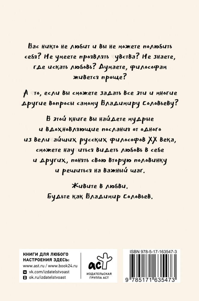 💳 Оплатить за товар можно при получении 🇰🇿 Есть бесплатная доставка по Казахстану от 1 дня 🎁 Копите бонусы с каждой покупки Серия: Вопросы философам Мы каждый день задаем себе сложные жизненные вопросы и не знаем, где найти на них ответы. А что, если бы вы могли задать их великому русскому философу Владимиру Соловьеву? В этой книге вы найдете мудрые и вдохновляющие послания от одного из величайших философов ХХ века, сможете научиться видеть любовь в себе и других, понять свою вторую половинку и решиться на важный шаг. |