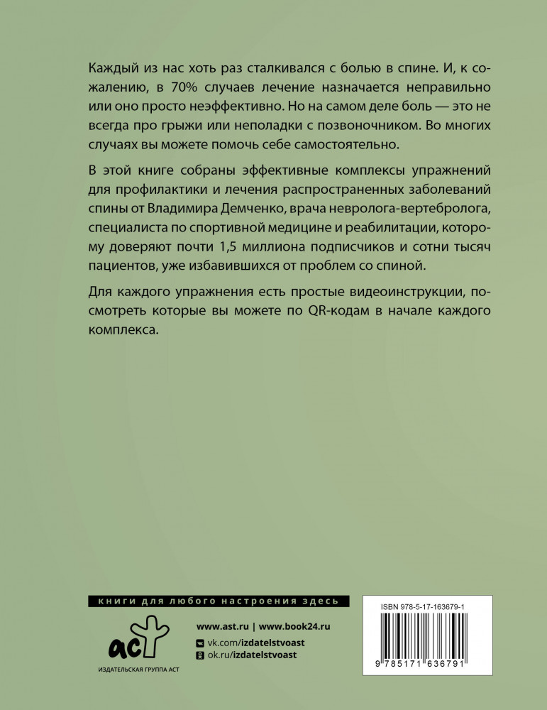 💳 Оплатить за товар можно при получении 🇰🇿 Есть бесплатная доставка по Казахстану от 1 дня 🎁 Копите бонусы с каждой покупки Серия: Азбука здоровья Каждый из нас хоть раз сталкивался с болью в спине. И, к сожалению, в 70% случаев лечение назначается неправильно или оно просто неэффективно. Но на самом деле боль — это не всегда про грыжи или неполадки с позвоночником. Во многих случаях вы можете помочь себе самостоятельно. В этой книге собраны эффективные комплексы упражнений для профилактики и лечения распространенных заболеваний спины от Владимира Демченко, врача невролога-вертебролога, специалиста по спортивной медицине и реабилитации, которому доверяют почти 1,5 миллиона подписчиков и сотни тысяч пациентов, уже избавившихся от проблем со спиной. |