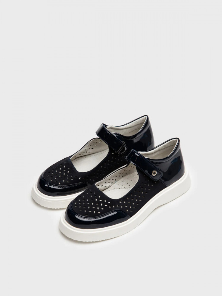 Школьные туфли для девочки подростка. Туфли выполнены из искусственной перфорированной лаковой кожи, белая подошва. Возвратный чересподъемный ремень на липучке дает возможность регулировать обувь на любой подъем. Подкладка выполнена из 100% натуральная кожа. Кожаная стелька с анатомическим элементом обеспечивает правильную нагрузку на стопу. Формоустойчивый задник поддерживает стопу в правильном положении. Подошва выполнена из легкой, гибкой, износостойкой резины. Туфли для девочки школьницы отлично подойдут как сменка в школу, а также для прогулок: весна, лето, ранняя осень.