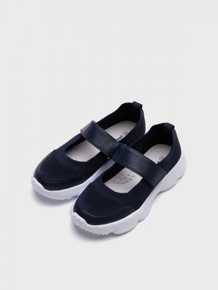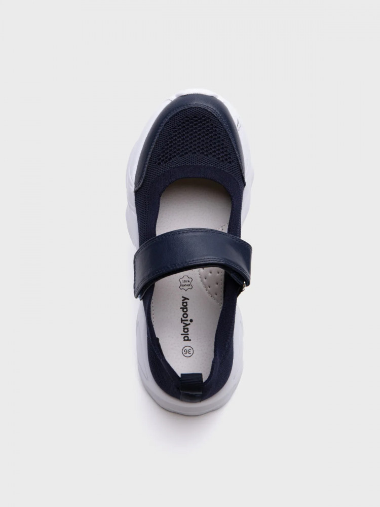 Школьные туфли для девочки-подростка. Туфли выполнены из вязанного текстиля, который обладает высокими показателями воздухопроницаемости. Носочная часть усилена деталью из искусственной кожи, белая подошва. Широкий возвратный чересподъемный ремень на липучке дает возможность регулировать обувь на любой подъем. Кожаная стелька с анатомическим элементом обеспечивает правильную нагрузку на стопу. Формоустойчивый задник поддерживает стопу в правильном положении. Подошва из ЭВА очень легкая и гибкая. Туфли для девочки школьницы отлично подойдут как сменка в школу, а также для прогулок: весна, лето, ранняя осень.