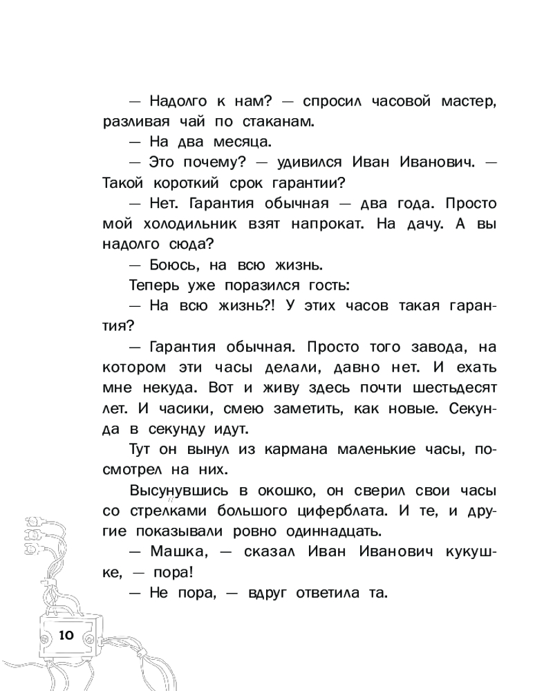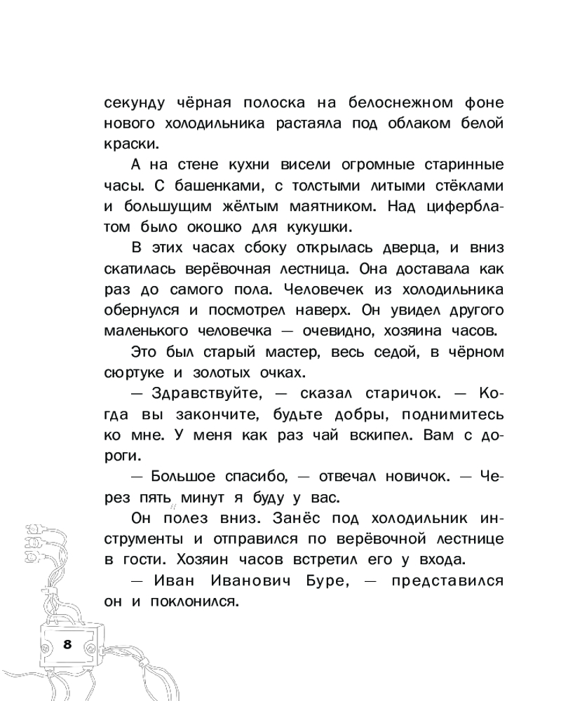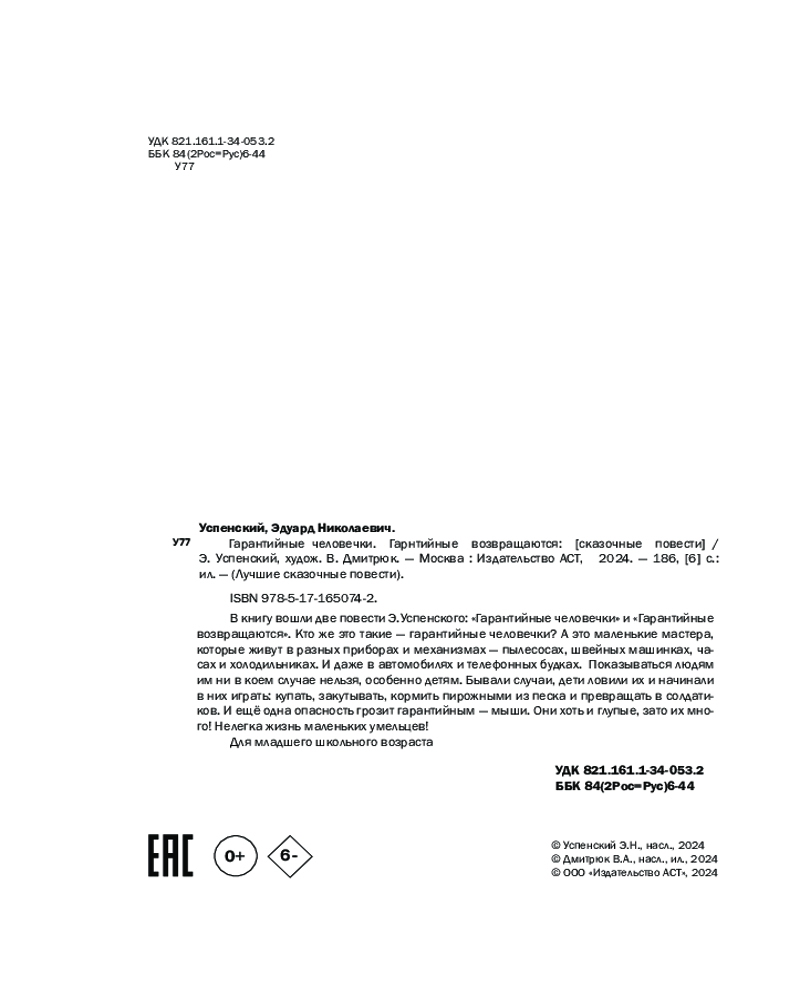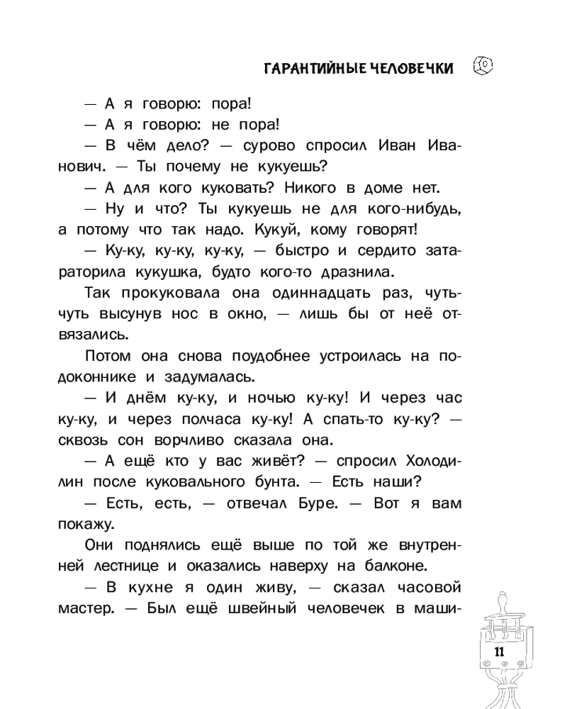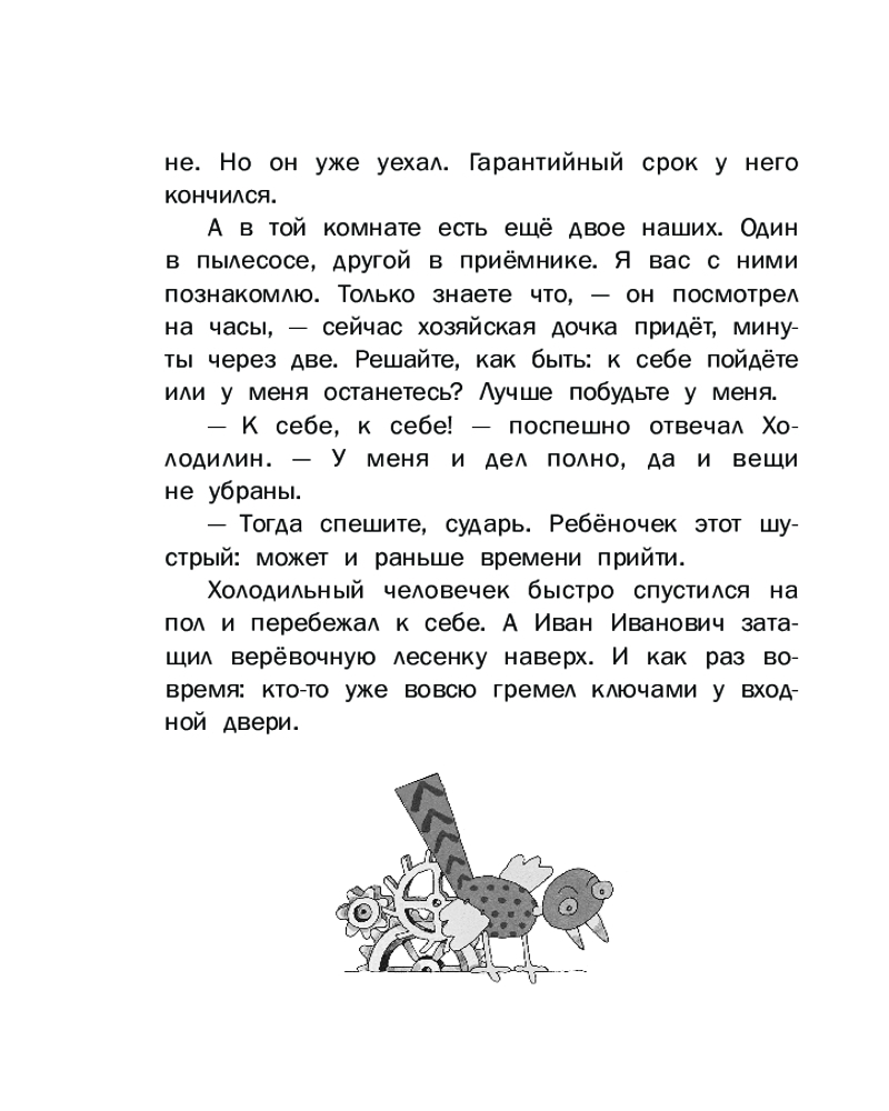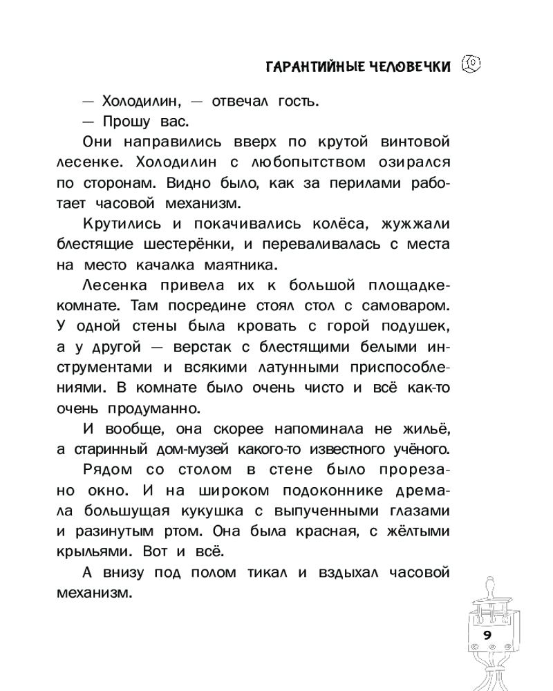 💳 Оплатить за товар можно при получении 🇰🇿 Есть бесплатная доставка по Казахстану 🎁 Копите бонусы с каждой покупки Серия: Лучшие сказочные повести В книгу вошли две повести Э.Успенского: «Гарантийные человечки» и «Гарантийные возвращаются». Кто же это такие — гарантийные человечки? А это маленькие мастера, которые живут в разных приборах и механизмах — пылесосах, швейных машинках, часах и холодильниках. И даже в автомобилях и телефонных будках. Показываться людям им ни в коем случае нельзя, особенно детям. Бывали случаи, дети ловили их и начинали в них играть: купать, закутывать, кормить пирожными из песка и превращать в солдатиков. И ещё одна опасность грозит гарантийным — мыши. Они хоть и глупые, зато их много! Нелегка жизнь маленьких умельцев! |