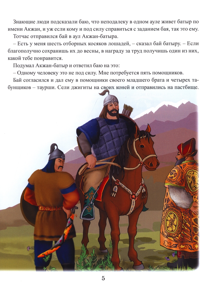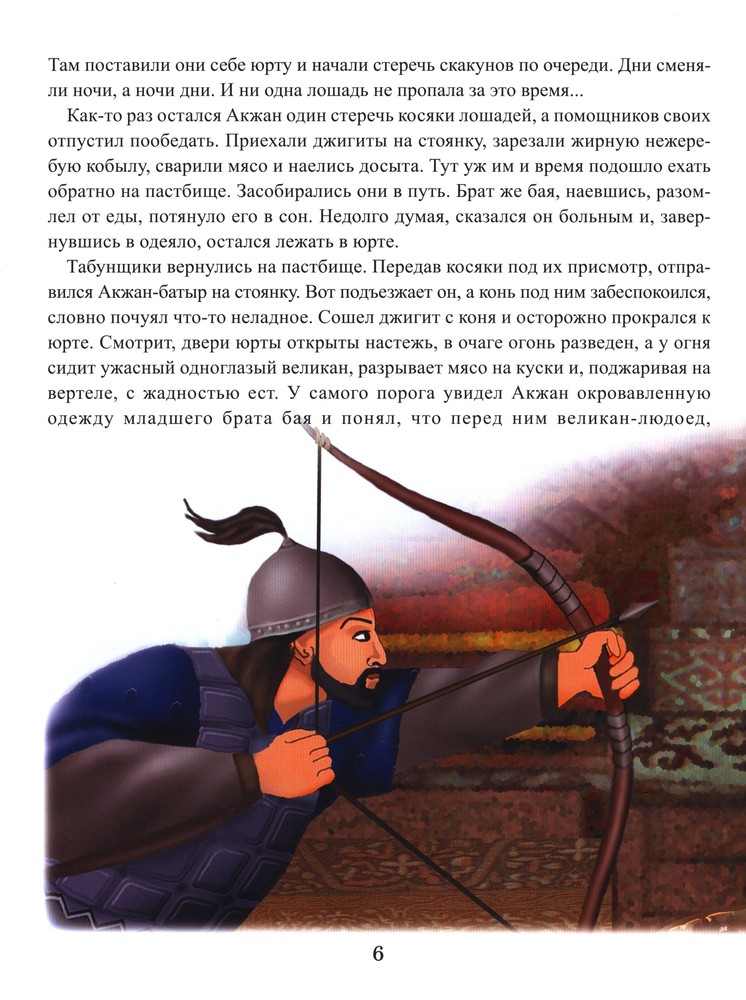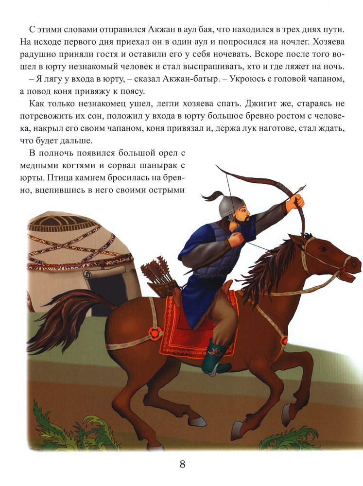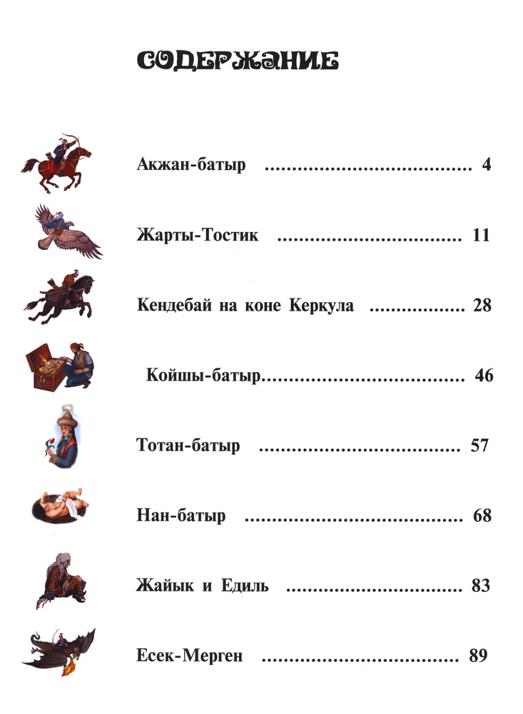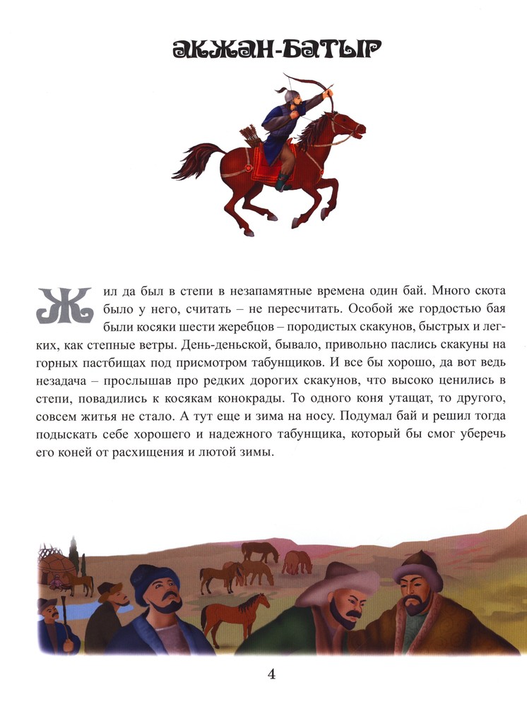 Мне понравились книги "Аруна" данной серии. Они отличаются отличным качеством, форматом и картинками. Содержание: 1. Акжан-батыр 2. Жарты-Тостик 3. Кендебай на коне Керкула 4. Койшы-батыр 5. Тотан-батыр 6. Нан-батыр 7. Жайык и Едиль 8. Есек-Мерген Думаю, данная книга больше понравится мальчикам, наша девочка не оценила по достоинству, больше предпочитает "Сказки о животных" и " Бабушкины сказки". Но покупкой довольна, подрастет, будет читать самостоятельно. Кстати, шрифт очень удобен для этой цели.