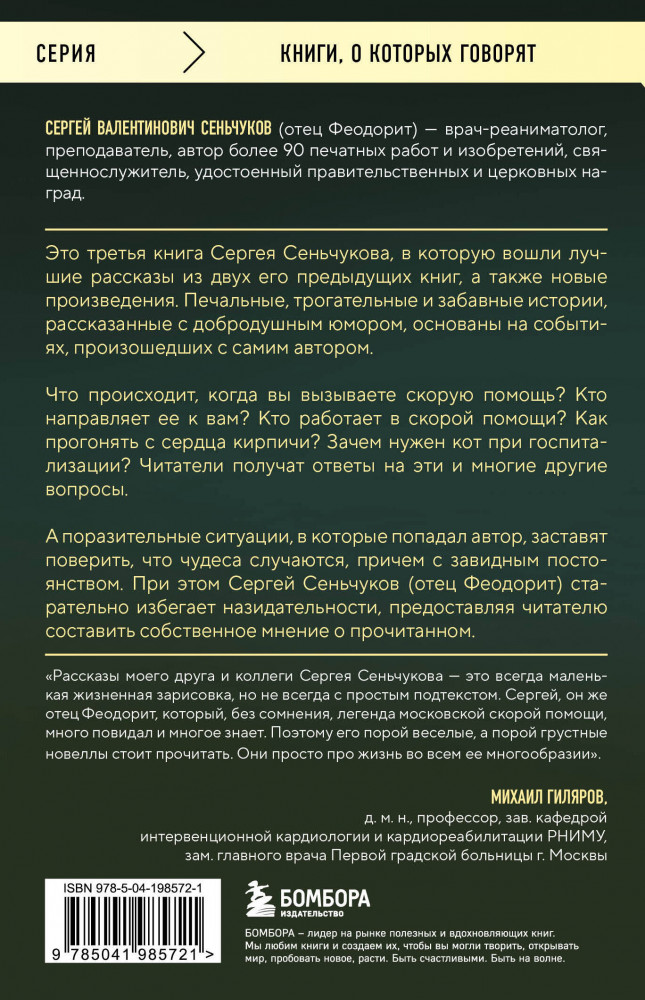 💳 Оплатить за товар можно при получении 🇰🇿 Есть бесплатная доставка по Казахстану от 1 дня 🎁 Копите бонусы с каждой покупки Серия: Книги, о которых говорят Сергей Сеньчуков (отец Феодорит) — врач-реаниматолог и иеромонах, много лет работающий на скорой помощи, помогая тем, кто оказался на грани жизни и смерти. Это третья книга автора, в которую вошли лучшие рассказы из двух его предыдущих сборников, а также новые произведения. Печальные, трогательные и забавные истории, рассказанные с добродушным юмором, основаны на событиях, случившихся с самим автором. Что происходит, когда вы вызываете скорую помощь? Кто направляет ее к вам? Кто работает в скорой помощи? Как прогонять с сердца кирпичи? Зачем нужен кот при госпитализации? Как одновременно спасти мир и обед? Читатели получат ответы на эти и многие другие вопросы. А поразительные ситуации, в которые попадал автор, заставят поверить, что чудеса случаются, причем с завидным постоянством. При этом Сергей Сеньчуков (отец Феодорит) старательно избегает назидательности, предоставляя читателю составить собственное мнение о прочитанном. |