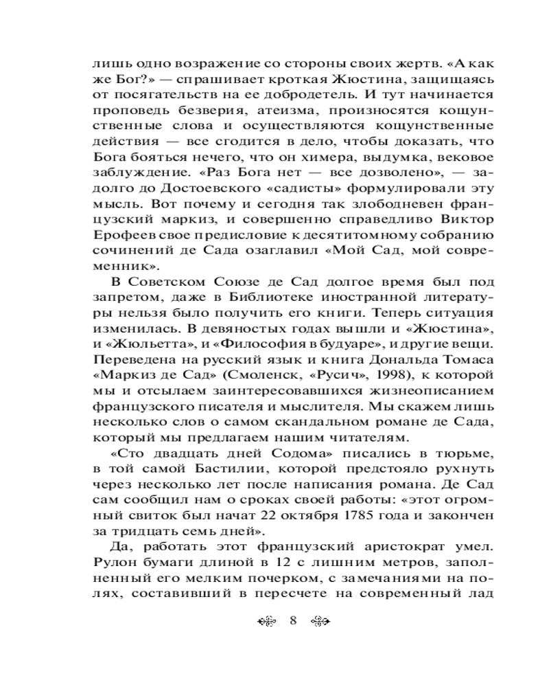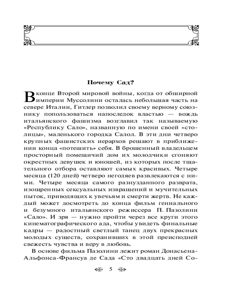 120 дней Содома, или Школа развратаВ данный момент этот товар отсутствует в продаже. Возможно, у нас найдется аналогичный или похожий товар здесь. Серия: Всемирная литература (новое оформление) В книге маркиз де Сад воспевает сексуальное удовольствие, которое заключается в том, чтобы причинять другому человеку боль, подвергать его унижению. Впоследствии именно после изучения работ маркиза де Сада сексолог Рихард фон Крафт-Эбинг ввел понятие «садизм». По мотивам книги снята драма Пазолини «Сало, или 120 дней Содома» — о последних днях итальянского фашизма. |