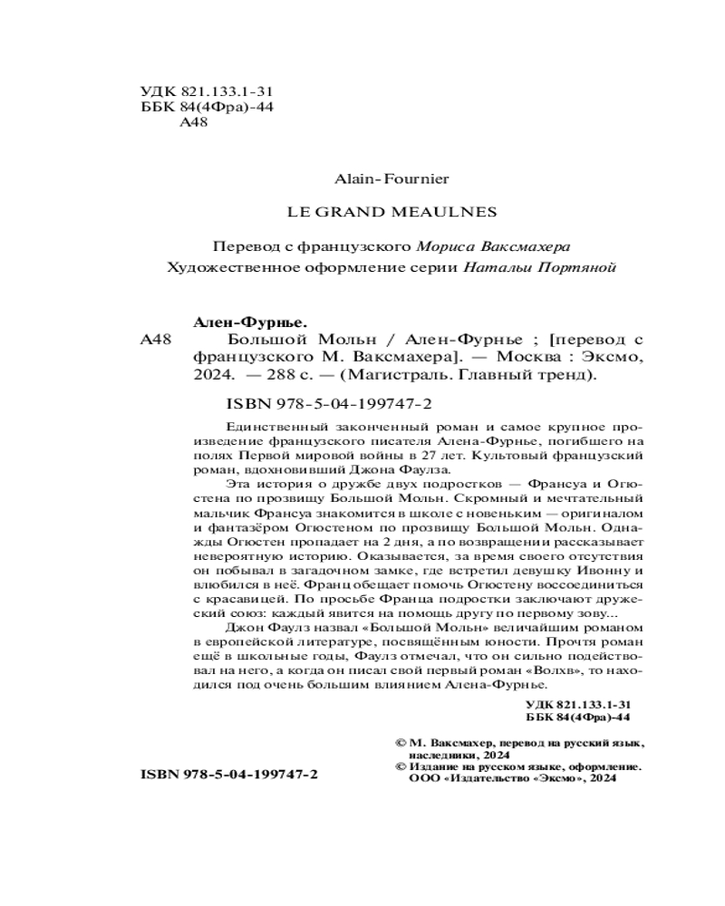 💳 Оплатить за товар можно при получении 🇰🇿 Есть бесплатная доставка по Казахстану 🎁 Копите бонусы с каждой покупки Серия: Магистраль. Главный тренд Единственный законченный роман и самое крупное произведение французского писателя Алена-Фурнье, погибшего в 27 лет на полях Первой мировой войны. Культовый текст о юношестве, вдохновивший самого Джона Фаулза. |