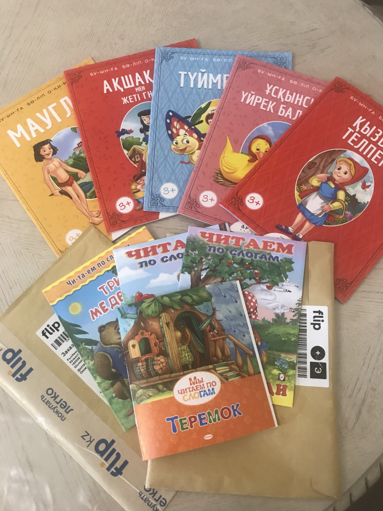 Взяли несколько сказок на казахском языке,начнём читать..книжки отличные, яркие, приятные на ощупь.