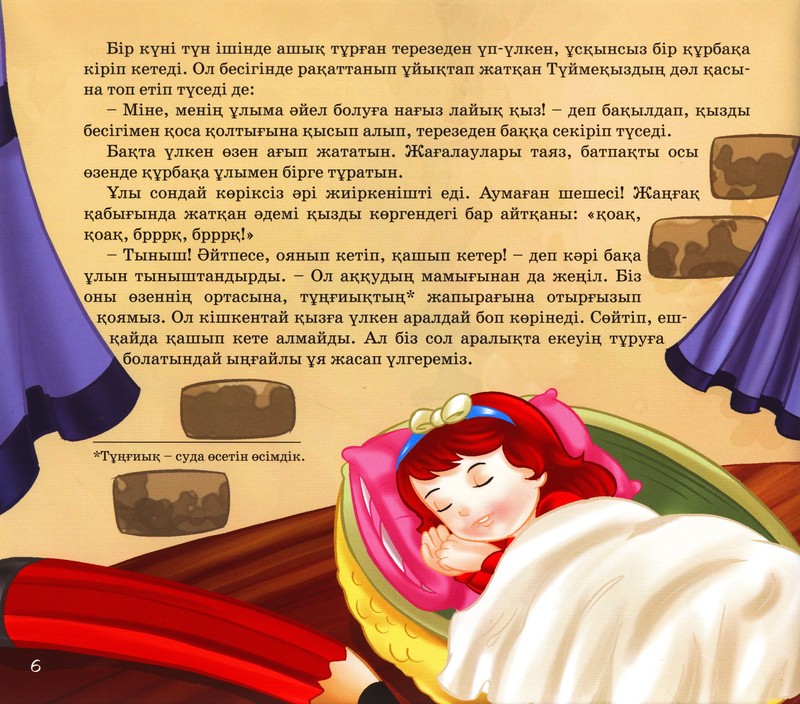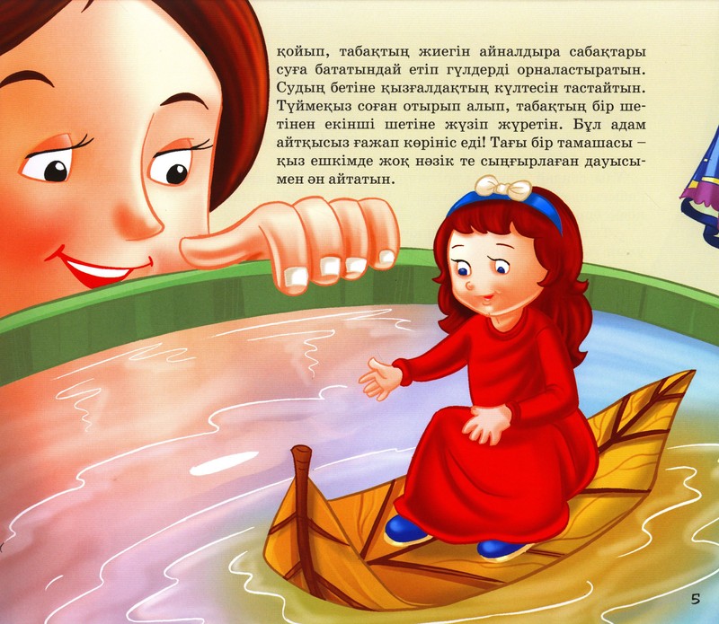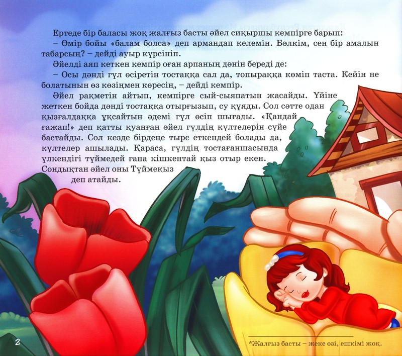 Әйел рақметін айтып, кемпірге сый-сыяпатын жасайды. Үйіне жеткен бойда дәнді тостаққа отырғызып, су құяды. Сол сәтте одан қызғалдаққа ұқсайтын әдемі гүл өсіп шығады. "Қандай ғажап!" деп қатты қуанған әйел гүлдің күлтелерін сүйе бастайды. Сол кезде бірдеңе тырс еткендей болады да, күлтелер ашылады. Қараса, гүлдің тостағаншасында үлкендігі туймедей ғана кішкентай қыз отыр екен. Сондықтан әйел оны Түймеқыз деп атайды. |