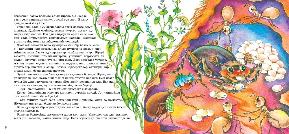 Жәндіктер туралы ертегілерВ данный момент этот товар отсутствует в продаже. Возможно, у нас найдется аналогичный или похожий товар здесь. Серия: Ертегілер елінде. В стране сказок Кішкентай құмырсқа көзін ашты. Аяғын басып тұрмақшы болып еді, тұра алмады. Әлдеқандай бір қоршаудың ішіндежатыр. "Мен кіммін? Қайдажатырмын?" Ол қоршауды теуіп, аузын барынша ашып, тістелей бастады. Шыдас бермеген қоршау айырылып кетті. Басын шығарып, жанжағына қарады. Айналасы толған бөшкеге ұқсас сопайған жұмыр бірдеңелер. Әлгілерден алты аяқты, басында екі мұртшасы бар тіршілік иелері шығып жатыр. Бәрінің түр-түстері бірдей. Ауыздары аңқайып, бір-біріне таңырқай қарайды. |