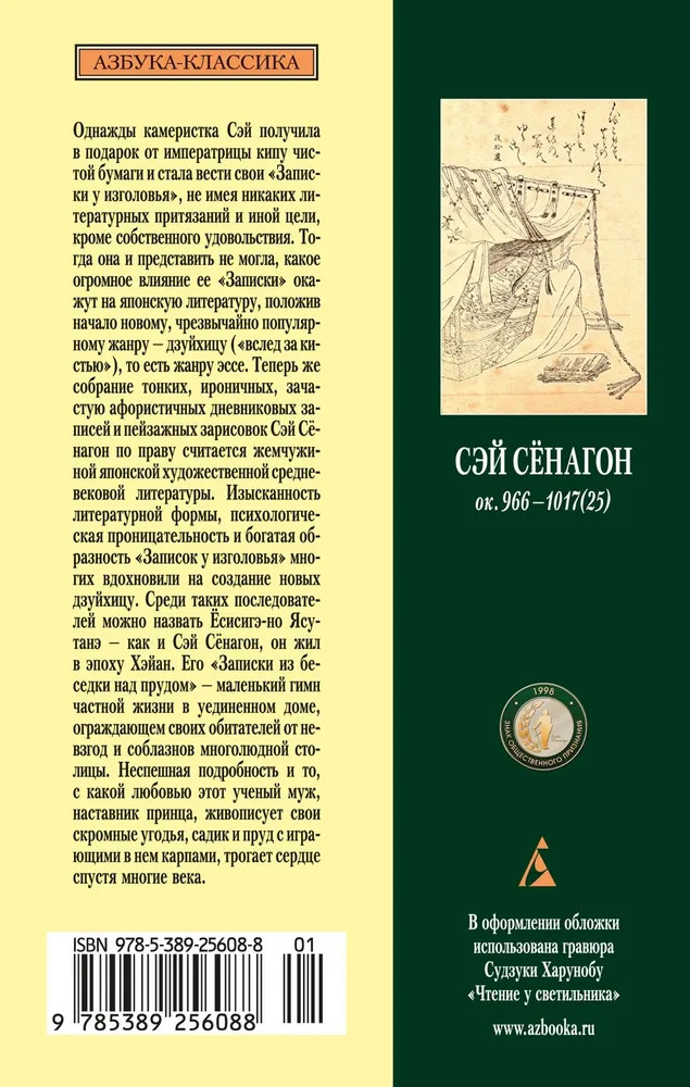 | Сэй-Сёнагон (дворцовое прозвище, настоящее имя неизвестно) — великая средневековая японская писательница и придворная дама при дворе юной императрицы Тэйси (Садако), супруги императора Итидзё эпохи Хэйан. Известна как автор книги «Записки у изголовья», давшей начало литературному жанру дзуйхицу в японской литературе. О жизни Сэй-Сёнагон известно мало. Она происходила из знатной семьи Киёхара. Её отец и прадед были известными японскими поэтами, но занимали мелкие малодоходные... |