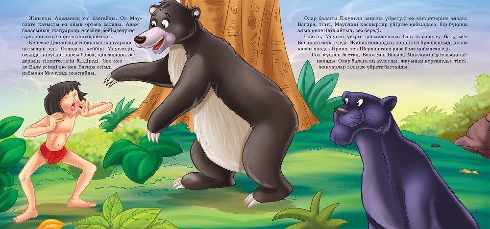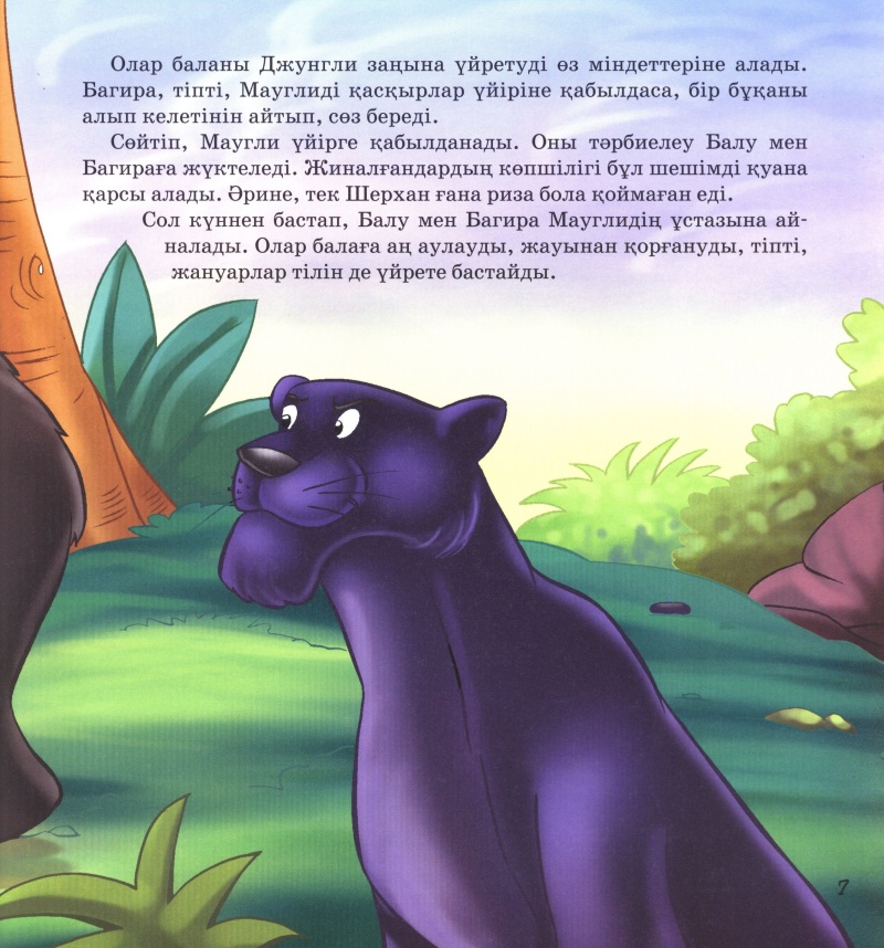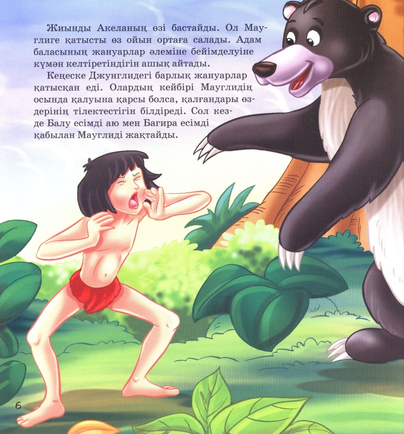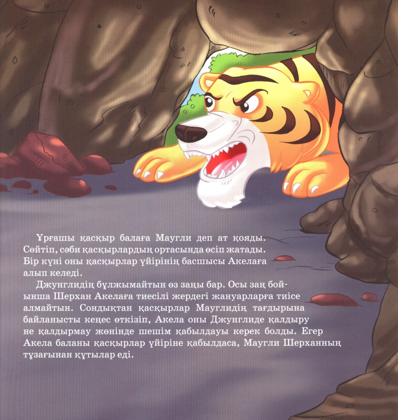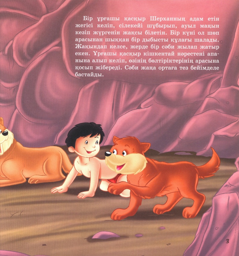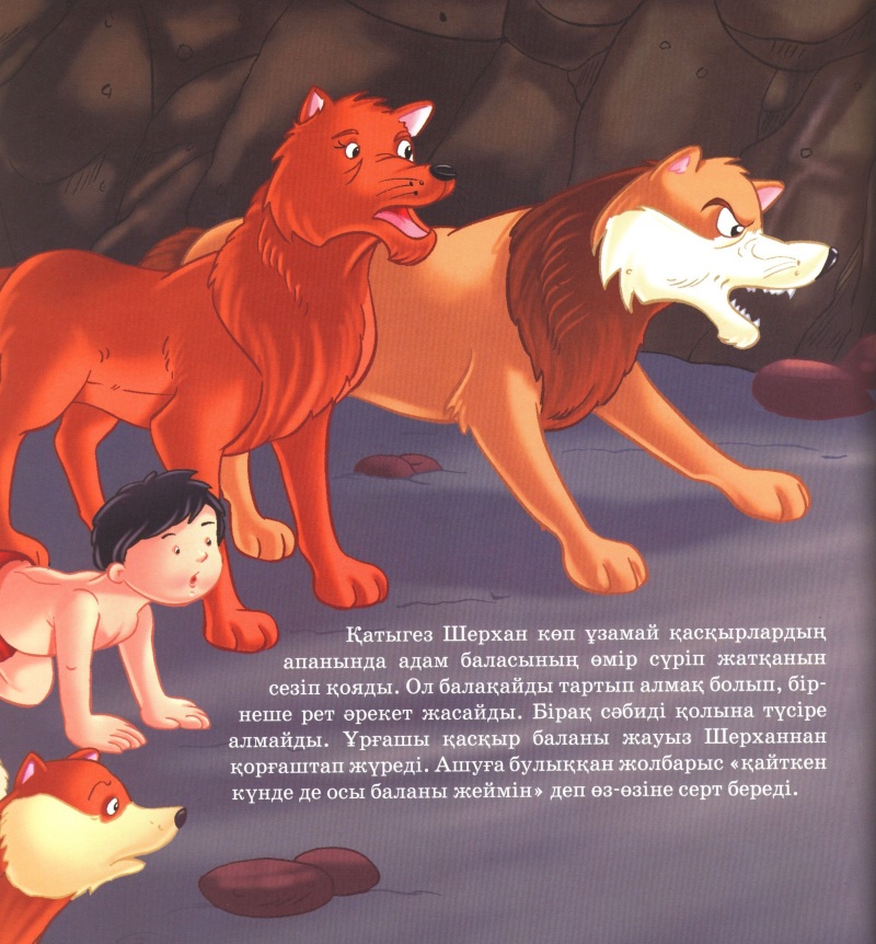 Бір ұрғашы қасқыр Шерханның адам етін жегісі келіп, сілекейі шұбырып, ауыл маңын кезіп жүргенін жақсы білетін. Бір күні ол шөп арасынан шыққанбір сәби жылап жатыр екен. Ұрғашы қасқыр кішкентай нәрестені апанына алып келіп, өзінің бөлтірітерінің арасына қосып жібереді. Сәби жаңа ортаға тез бейімделе бастайды.