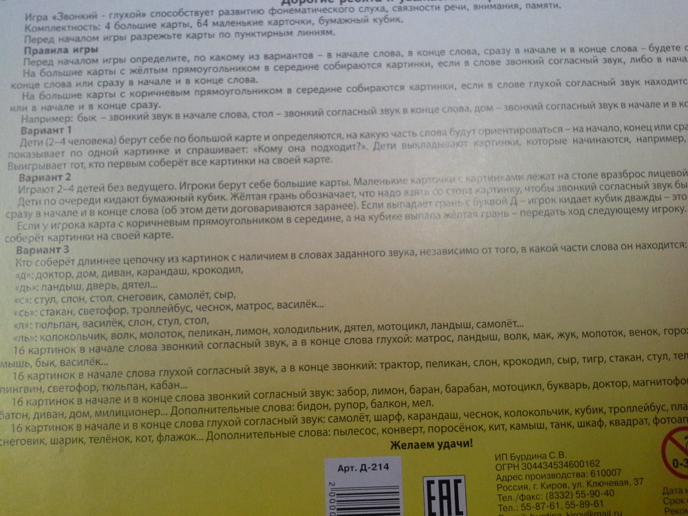 💳 Оплатить за товар можно при получении 🇰🇿 Есть бесплатная доставка по Казахстану от 1 дня 🎁 Копите бонусы с каждой покупки Серия: Забавы в картинках Фонетическое лото.Способствует развитию фонематического слуха, связной речи, внимания, памяти. Перед началом игры необходимо разрезать карточки. Возможны варианты различных игр, которые описаны в правилах игры. Перед началом игры определите, по какому из вариантов: в начале слова, в конце слова, сразу в начале и в конце слова будете собирать карту. На большие карты с желтым прямоугольником в середине собираются картинки, если в слове звонкий согласный звук либо в начале слова, либо только в конце слова или сразу в начале и в конце слова. |