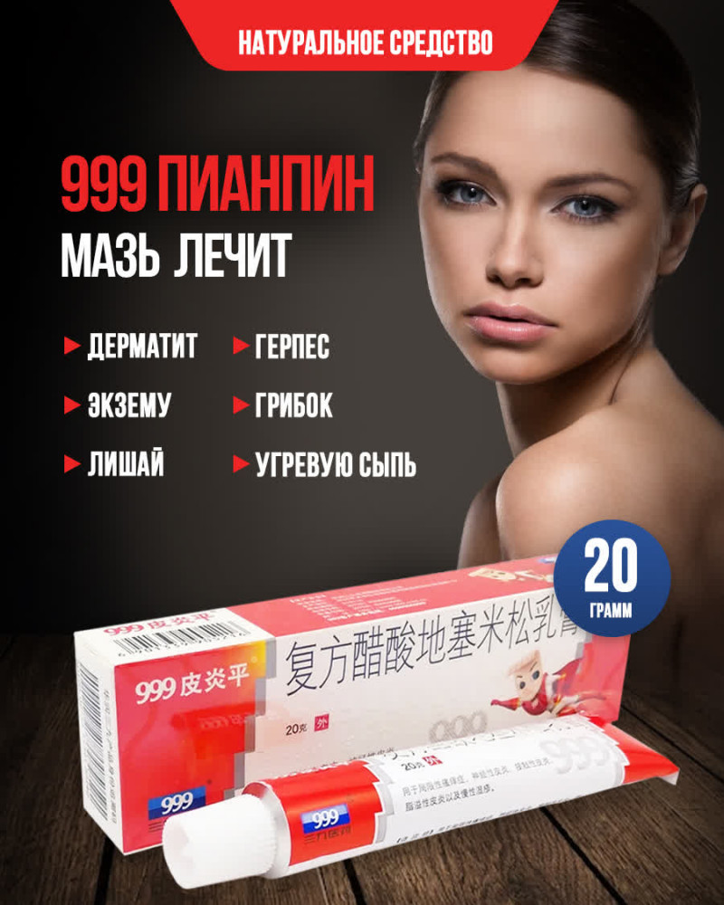Мазь 999, Пианпин получила самые высокие отзывы за свою эффективность при лечении таких заболеваний как герпес, нейродермит, псориаз, дерматит, угревая сыпь, грибковые поражения и др. кожных высыпаний. Мазь 999, Пианпин до сих пор остаётся незаменимым по эффективности средством для многих людей страдающих различными заболеваниями кожи.