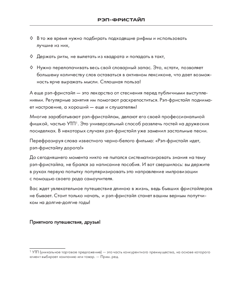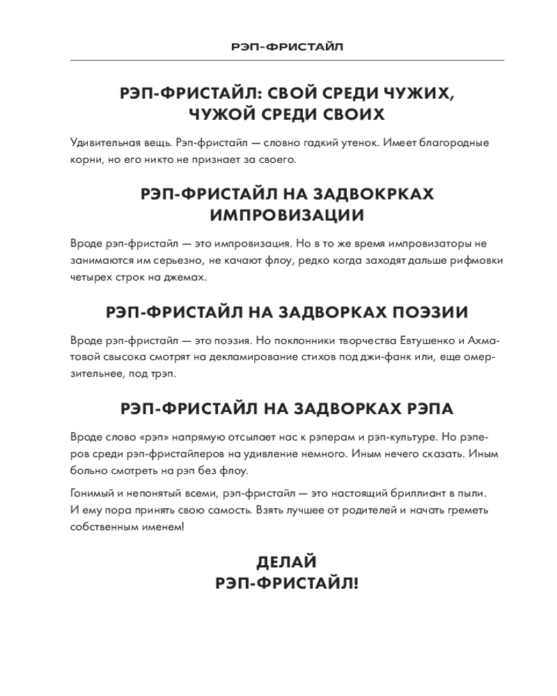 «Попадись мне это пособие раньше, я стал бы первым человеком, который собрал своим фристайлом «Олимпийский». — Андрей Кратицкий (МС Филя), победитель V1 Battle, четырехкратный победитель баттла Sniсkers Урбания.