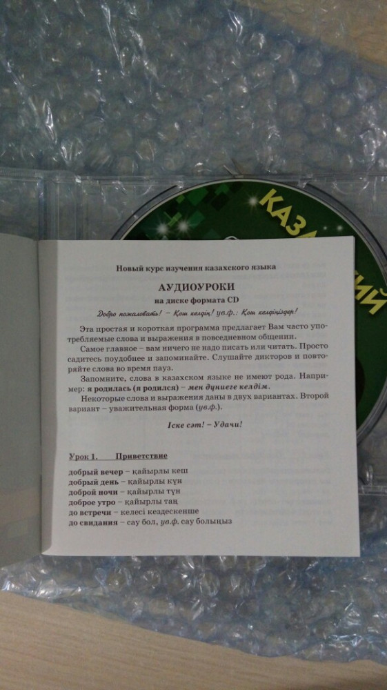 На диске 18 упражнений. Обложка диска — брошюрка с транскрипцией слов и выражений из упражнений. Иногда не понятно, что говорит диктор, но можно посмотреть там. Для меня была проблема, найти привод для дисков и скопировать от туда аудио файлы. Сделал через Windows Media player. Лучше бы давали временную ссылку на облачный диск, компакт диски то уже не актуальны. Имхо В целом я доволен. За свою цену — отличный продукт. Рекомендую. Теперь могу маломальски на ломаном, поговорить в магазине на казахском.