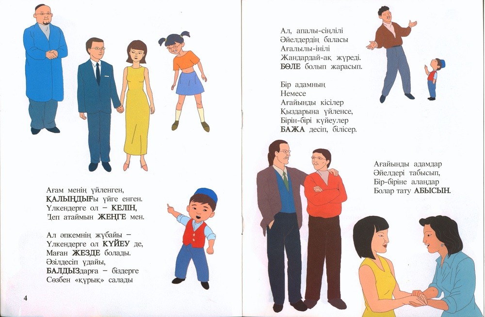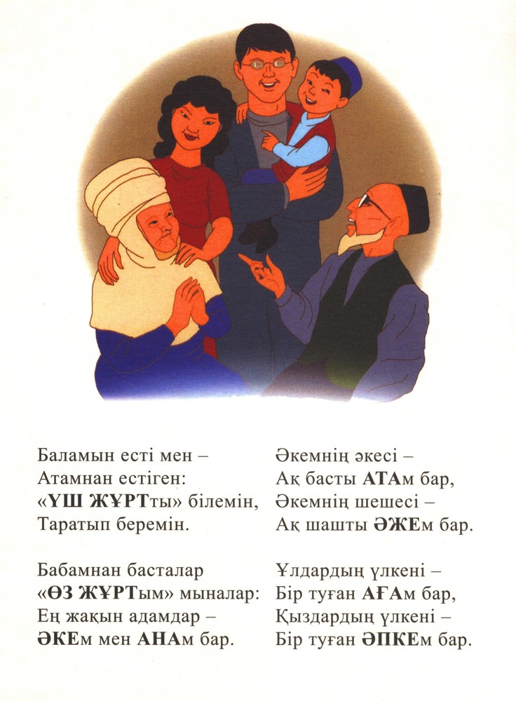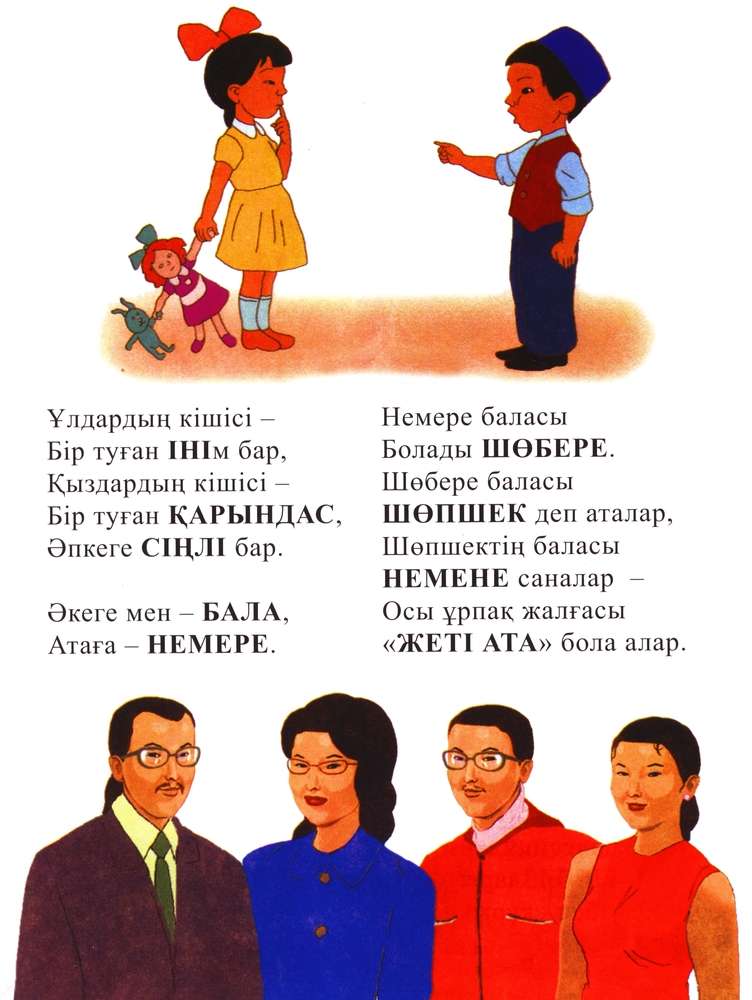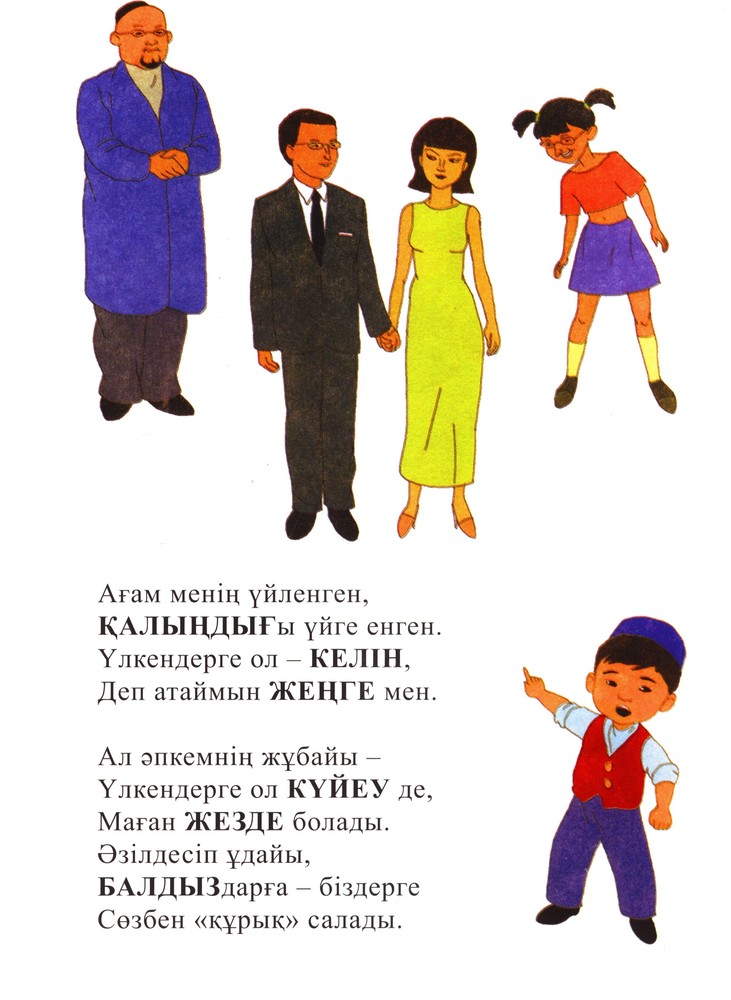 Бала ұғатын қысқаша тақпақтар арқылы туыстардың қалай аталатындығы жеткізілген.
