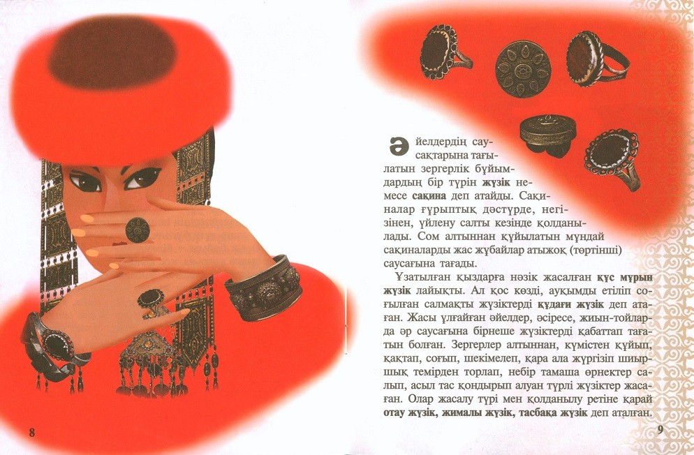 Қазақтың зергерлік бұйымдарыВ данный момент этот товар отсутствует в продаже. Возможно, у нас найдется аналогичный или похожий товар здесь. Серия: Сен білесің бе? - 2 Шашбау да бір-біріне сым үзбелер арқылы бекітіледі. Орталарына асыл тастардан көз қондырылған теңгелер тізбегінен қүралады. Ұшы сәнді шашақпен немесе күміс әшекейлермен әсемделеді. Шашбау шаштың түбіне бекітіліп, бұрыммен бірге салбырай төгіліп тұрады. |