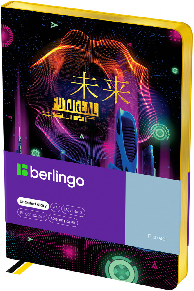 Стильный недатированный ежедневник Berlingo Futureal формата A5 имеет ультрамягкую обложку из высококачественной экокожи и золотой срез. Изделие выполнено в ярком футуристичном дизайне коллекционной серии Berlingo Futureal. Внутренний блок состоит из 136 листов высококачественной кремовой бумаги повышенной плотности 80 г/м² с пантонной печатью в 2 краски. Представлен в размере 143 × 210 мм.