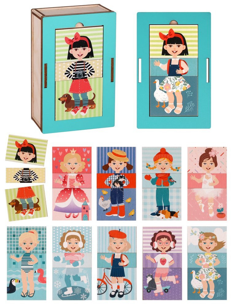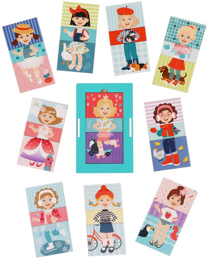 Набор пазлов для малышей состоит из рамки-основания и 30-ти деталей с изображением куколки и элементов одежды. Из деталей набора можно собрать 10 готовых нарядов. Элементы можно сочетать как угодно и создавать новые образы, проявляя творческие способности и креативность. Каждый пазл состоит из трех частей.