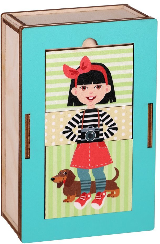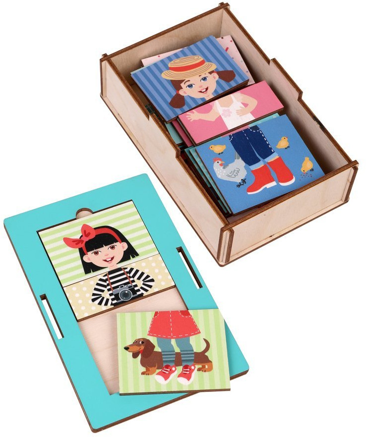 Положите перед ребенком собранный пазл и попросите внимательно рассмотреть картинку. Достаньте детали пазла из основания и предложите малышу собрать из них картинку самостоятельно, а затем заменить одну или несколько деталей из готового пазла, собрав еще один наряд. Творческий пазл поможет малышу развить память, логику и наглядно-образное мышление, выучить названия элементов гардероба. Логическая игра направлена на развитие мелкой моторики, терпения и усидчивости. Детали головоломки удобно хранить – в специальной коробке. Крышка коробки служит рамкой для сборки пазлов.