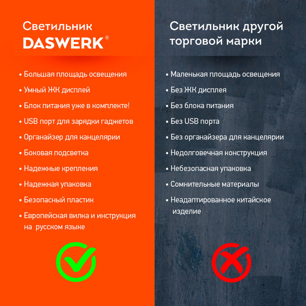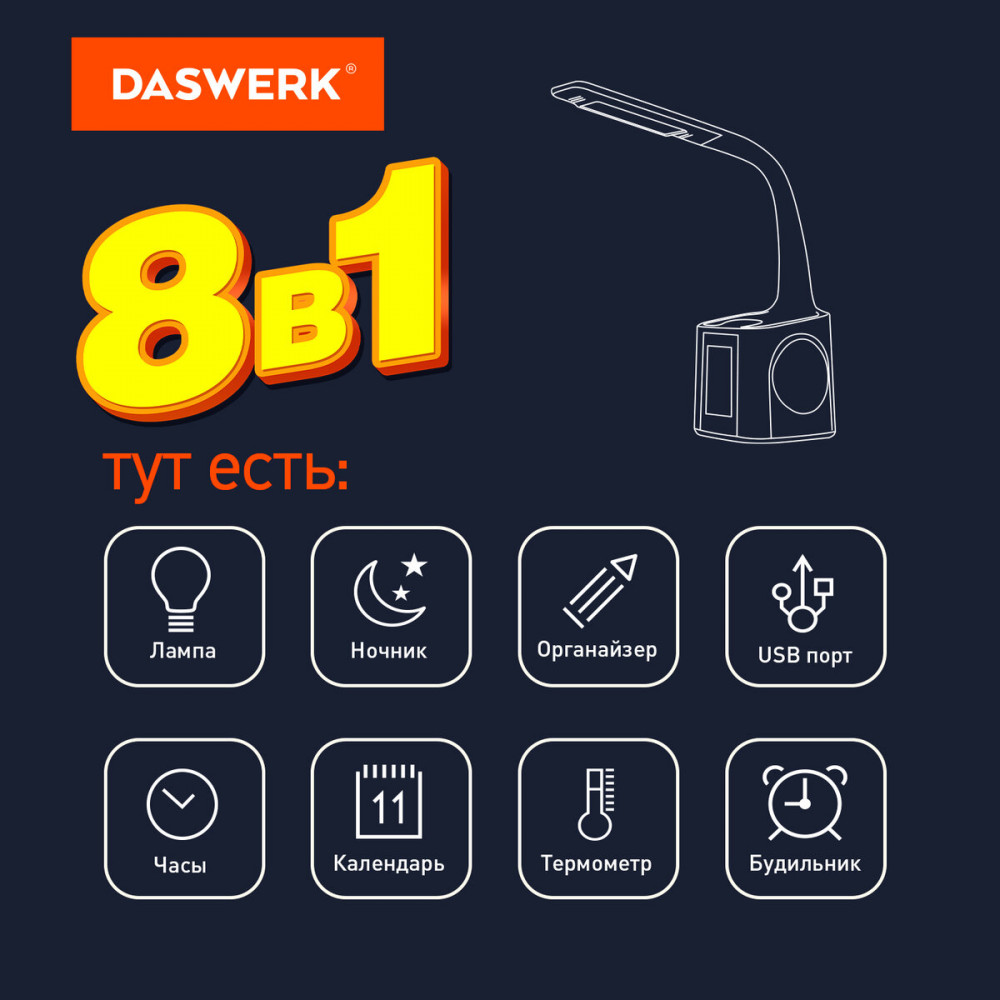 💳 Оплатить за товар можно при получении 🇰🇿 Есть бесплатная доставка по Казахстану от 1 дня 🎁 Копите бонусы с каждой покупки Многофункциональный светильник DASWERK является незаменимым атрибутом рабочего места. Светильник оборудован ЖК-дисплеем, органайзером для канцелярии, USB-разъемом для зарядки гаджетов, RGB-подсветкой. Отличный вариант для школьника и студента. |