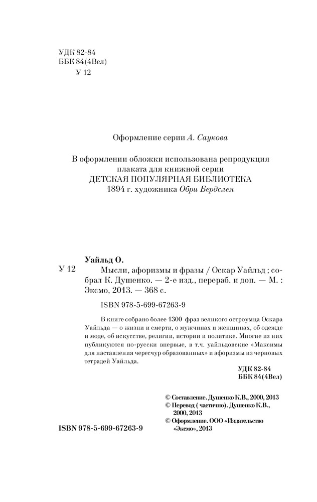 В данный момент этот товар отсутствует в продаже. Возможно, у нас найдется аналогичный или похожий товар здесь. Серия: Pocket Book (обложка) В книге собрано более 1300 фраз великого остроумца Оскара Уайльда — о жизни и смерти, о мужчинах и женщинах, об одежде и моде, об искусстве, религии, истории и политике. Многие из них публикуются по-русски впервые, в т. ч. уайльдовские «Максимы для наставления чересчур образованных» и афоризмы из черновых тетрадей Уайльда. |