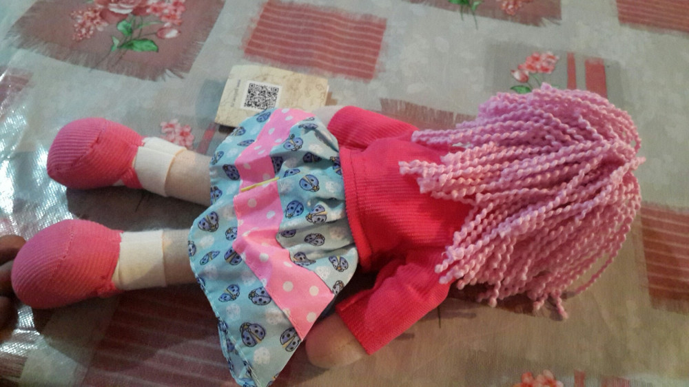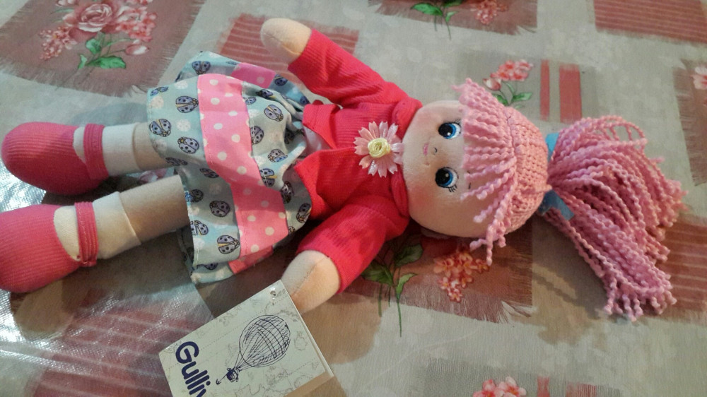 Решила заказать для дочки ее первую куколку. Так как нам 6 мес, то думала как раз мягкая и легкая. В принципе все хорошо, но мне как допытливой мамаше, честно, не понравилось качество игрушки. Платье да и в принципе все остальное сшито не очень аккуратно. Везде ниточки торчат и кривые строчки. Но благо ребенку то этого не понять, и дочка очень хорошо отреагировала на куколку!
