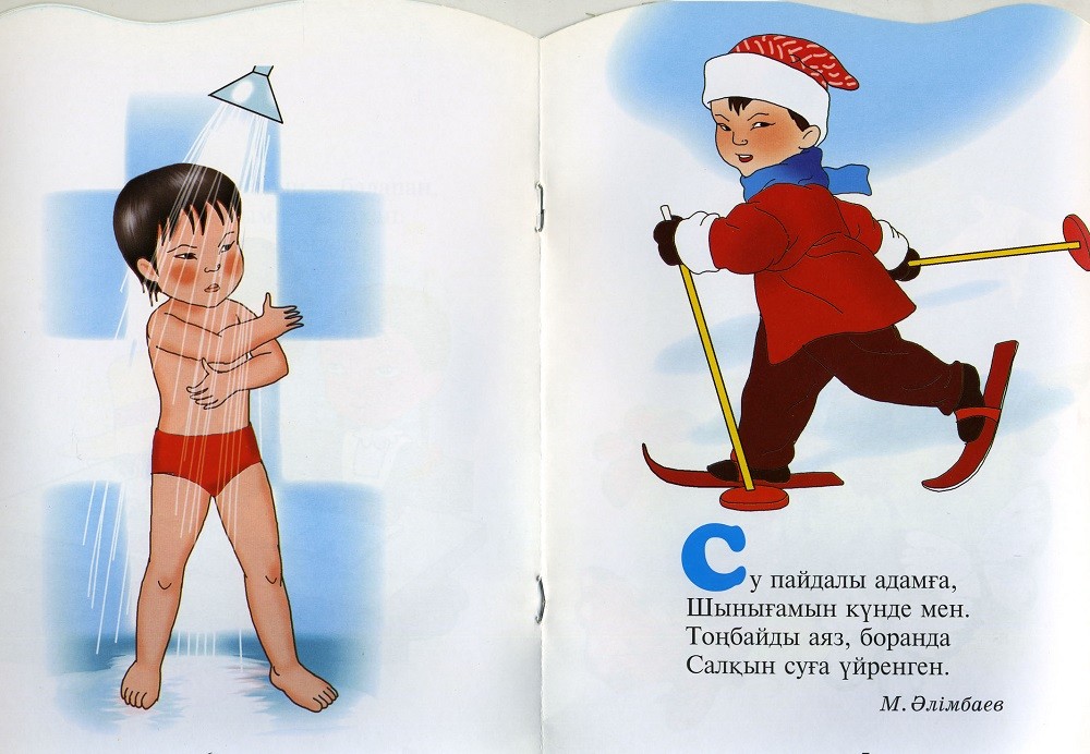 Тонкая яркая среднего размера книжка. На казахском языке, стихи хорошие прочитали, но еще не учили, около десяти страничек. Цена супер.