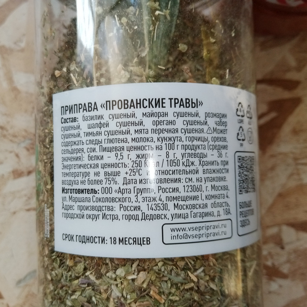 Думала придет не большая баночка, а пришла туба. Приятно удивил объем.Смотрится солидно и красиво. Тара пластиковая с крышкой. Даже когда закончатся прованские травы, в такой таре можно хранить что-то другое. Пока не открывала.