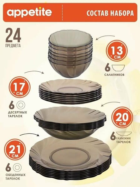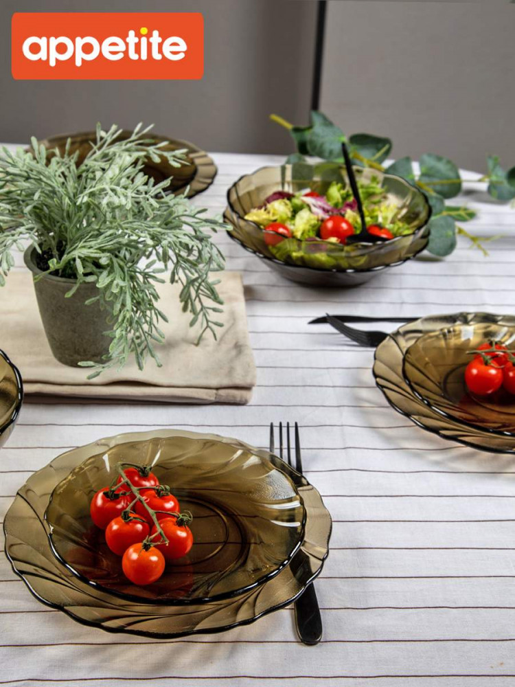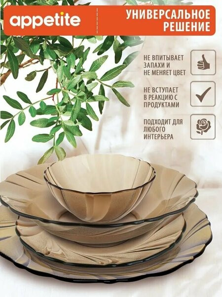 💳 Оплатить за товар можно при получении 🇰🇿 Есть бесплатная доставка по Казахстану от 1 дня 🎁 Копите бонусы с каждой покупки Серия: Bronze Набор столовой посуды Bronze из дымчатого стекла благородного коричневого цвета, идеально подходит для ежедневного использования. Лаконичная и изящная посуда станет изюминкой на любой кухне и добавит элегантности сервировке блюд. Посуда устойчива к появлению царапин и резким перепадам температур, ее можно использовать в микроволновой печи (СВЧ) и мыть в посудомоечной машине. Набор рассчитан на 6 персон. |