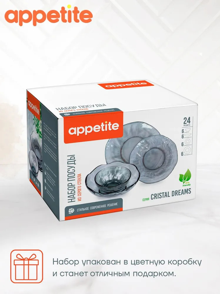 💳 Оплатить за товар можно при получении 🇰🇿 Есть бесплатная доставка по Казахстану от 1 дня 🎁 Копите бонусы с каждой покупки Серия: Cristal Dreams Набор столовой посуды Cristal Dreams ТМ Appetite из серого стекла благородного оттенка, идеально подходит для ежедневного использования. Лаконичная и изящная посуда станет изюминкой на любой кухне и добавит элегантности сервировке блюд. Посуда устойчива к появлению царапин и резким перепадам температур. Набор рассчитан на 6 персон. |