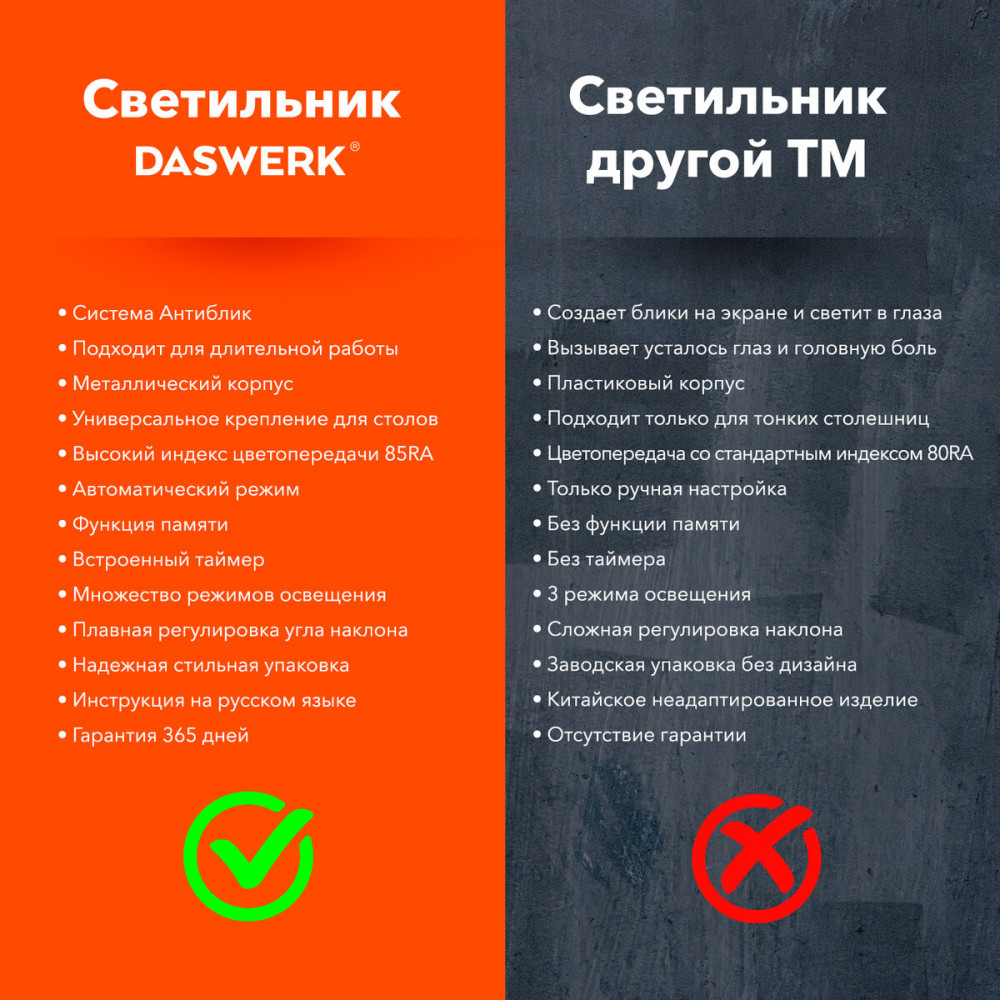 Специально разработанный ассиметричный источник света обеспечивает освещение широкой рабочей зоны без мерцания и пульсации, не светит в глаза и не создает блики. Направленный свет лампы DASWERK не вызывает усталость и не создает дискомфорт даже при длительной работе.
