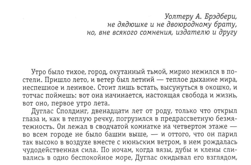 Когда редактор Уолтер Брэдбери изучил рукопись, у него появилась идея. Он сказал писателю: «Возьми эту книгу за уши и потяни в разные стороны. Она разорвётся на две части. Каждая вторая выпадет, а оставшиеся займут своё место. Они образуют твою первую книгу, а оставшиеся — продолжение». Брэдбери так и поступил. Первая книга сохранила название «Вино из одуванчиков», а вторая пролежала до 2005-го года, увидев свет под названием «Лето, прощай». Чтобы заполнить пробелы, оставшиеся из-за выпавших рассказов, Брэдбери написал связующие главки. В результате и получилась эта повесть в рассказах о мальчике, который размышляет о времени и смерти. Чтобы текст был больше похож на повесть, Брэдбери убрал из него названия рассказов. |