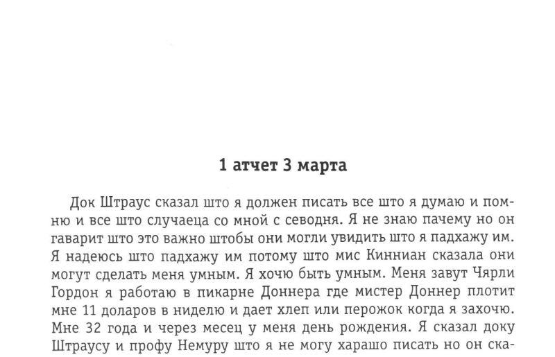 Супер книга! Давно не получала такого удовольствия от чтения книги... Настолько трогательно, тонко описана судьба Чарли, что в некоторых моментах слезы наворачиваются на глаза! Это стоит прочитать, чтобы ценить то, чем одарил нас Бог с рождения! Всем советую, читается на одном дыхании!