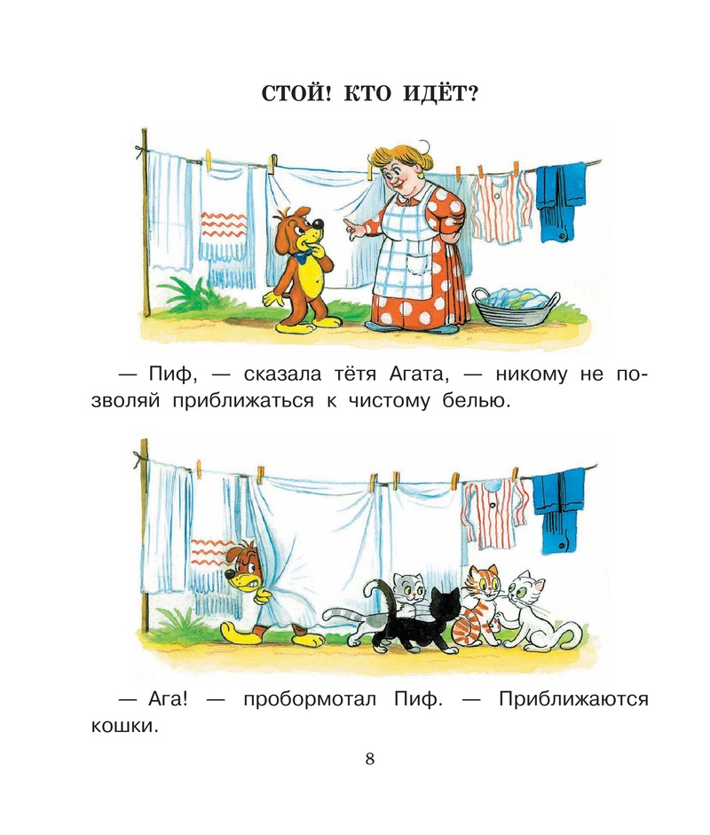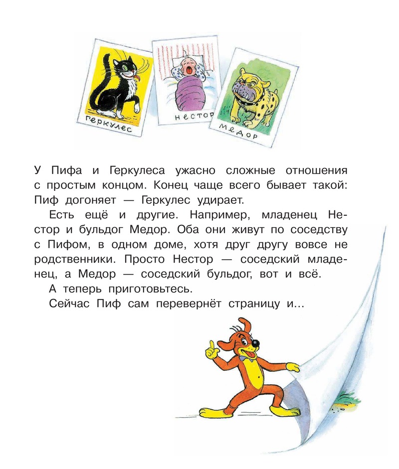 Теперь, прочитав нашу книжку, и ты сможешь узнать о приключениях Пифа. А ещё — о приключениях котёнка по имени Гав и его приятеля Щенка, о которых рассказали писатель Г. Остер и художник В.Сутеев.