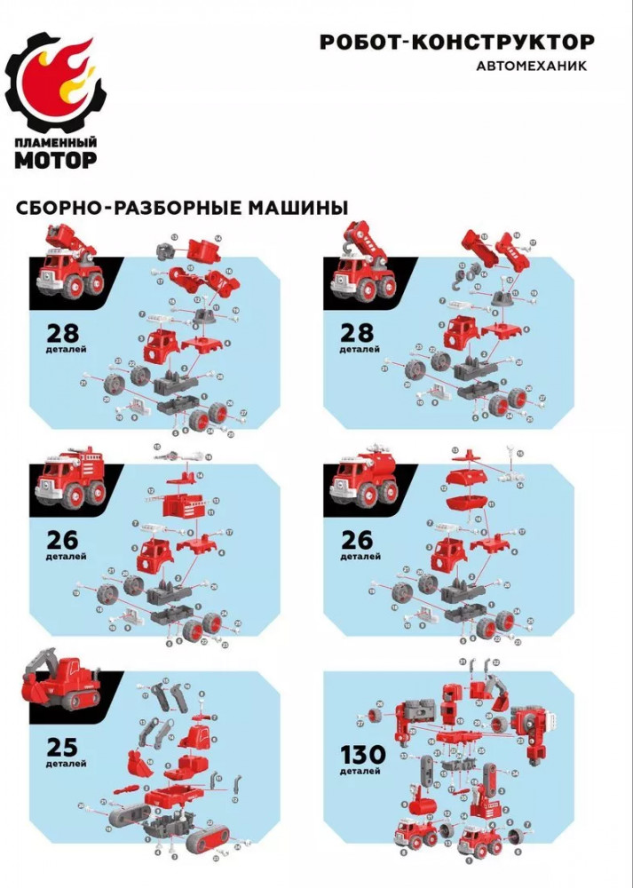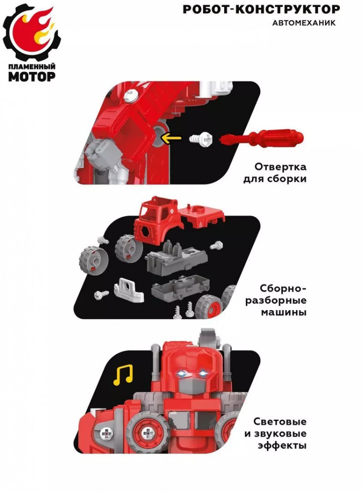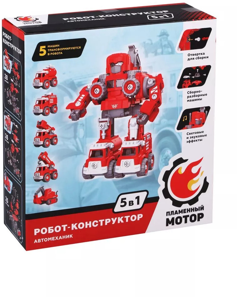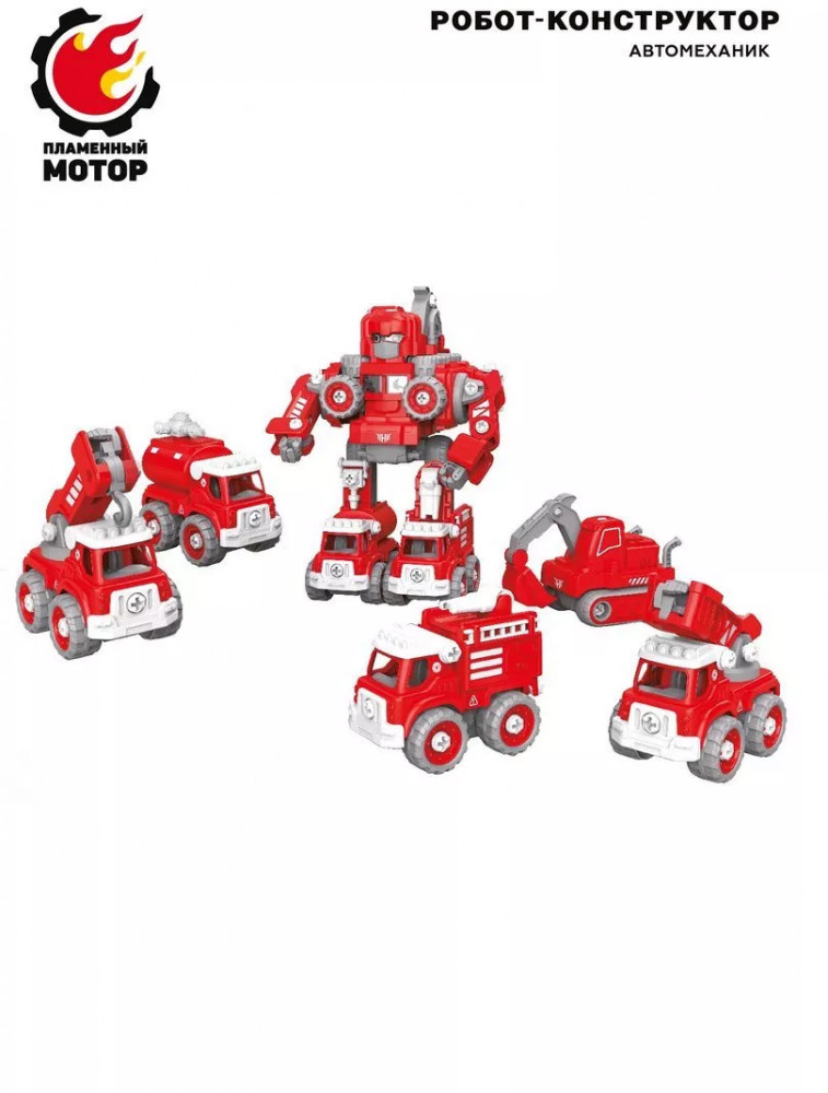 Пламенный мотор Робот-конструктор «Автомеханик»В данный момент этот товар отсутствует в продаже. Возможно, у нас найдется аналогичный или похожий товар здесь. Робот-конструктор «Автомеханик» — это сразу 5 машин пожарной техники в одном наборе! Все машинки выполнены по принципу конструктора-скрутки: каждую из них можно собирать и разбирать при помощи входящей в комплект отвертки. А когда захочется чего-то еще более увлекательного, машины можно будет трансформировать в одного крутого робота со светозвуковыми эффектами. При нажатии на кнопку игрушка воспроизводит звуки пожарной сирены, сопровождаемые динамичным мерцанием подсветки. |