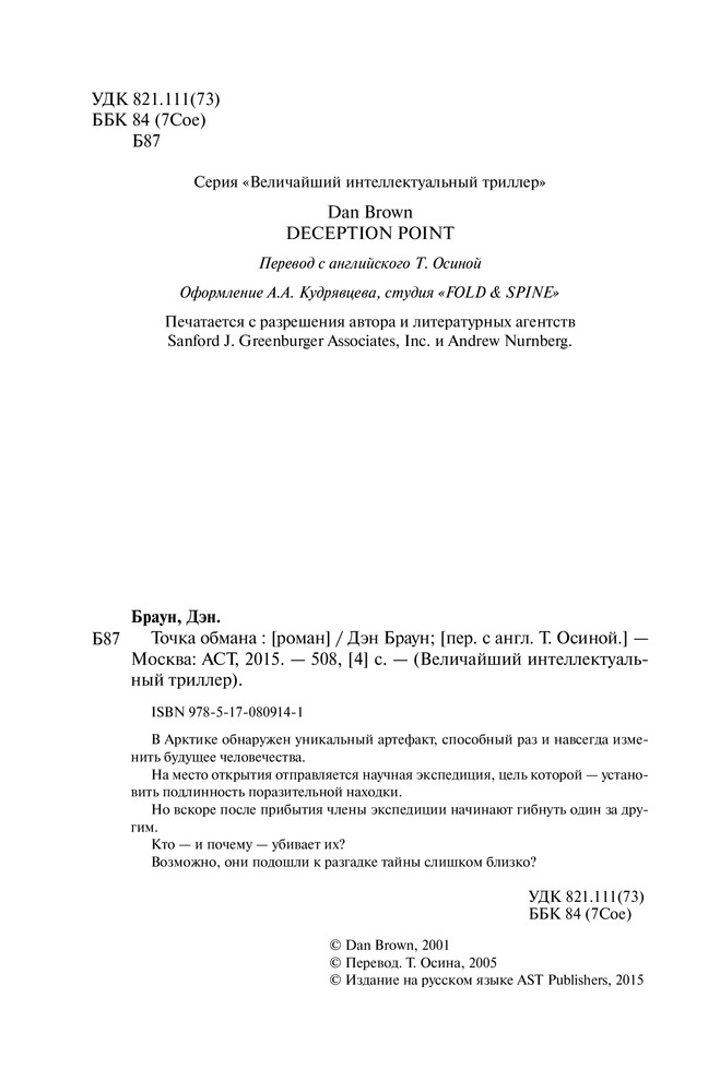 В этой книге, как всегда у Брауна, есть все: и любовь, и интрига, и лихо закрученный сюжет. Книга читается на одном дыхании. Ну, и конечно, если в первой главе у Дэна на стене висит ружье, то во второй главе оно обязательно выстрелит: никаких лишних деталей, все продуманно до мелочей и является частью сюжета.