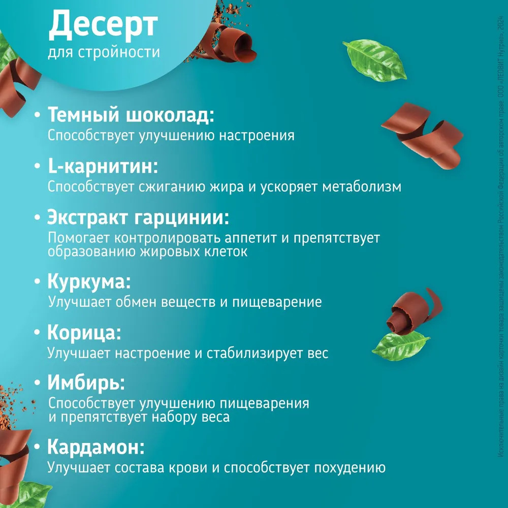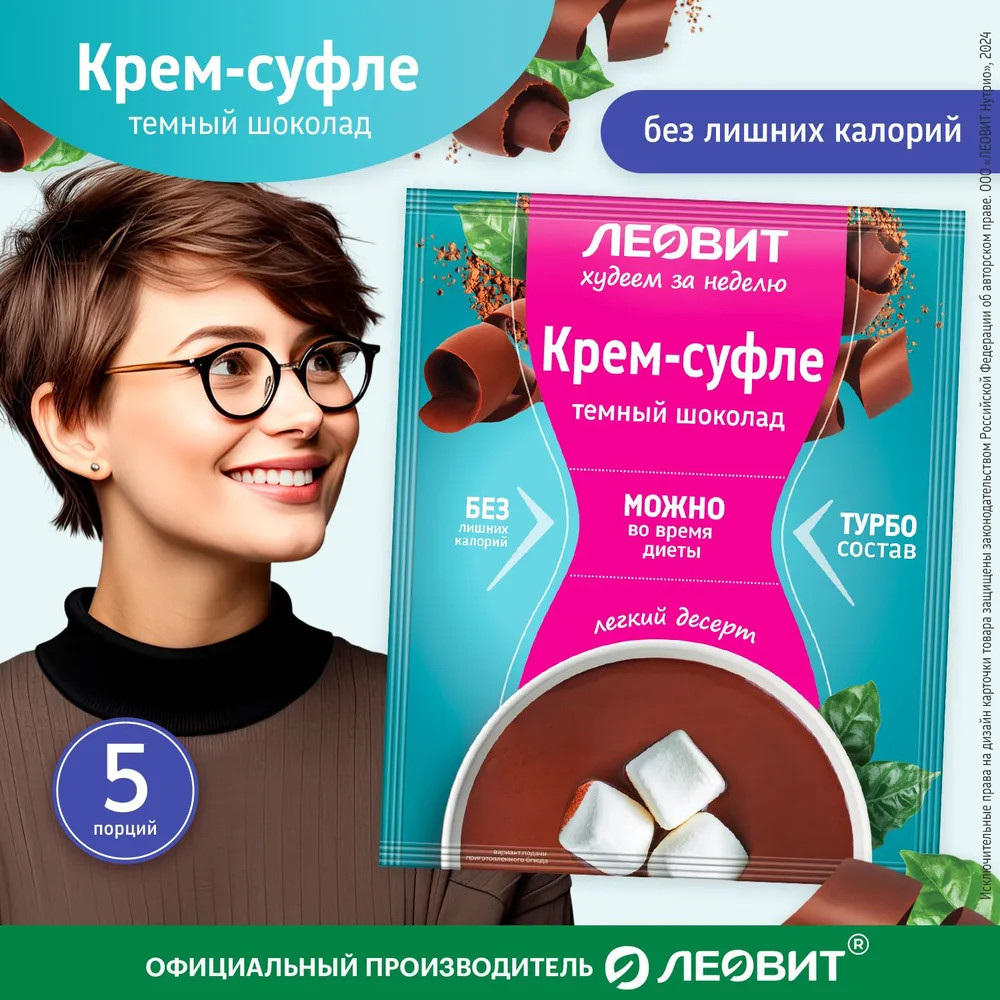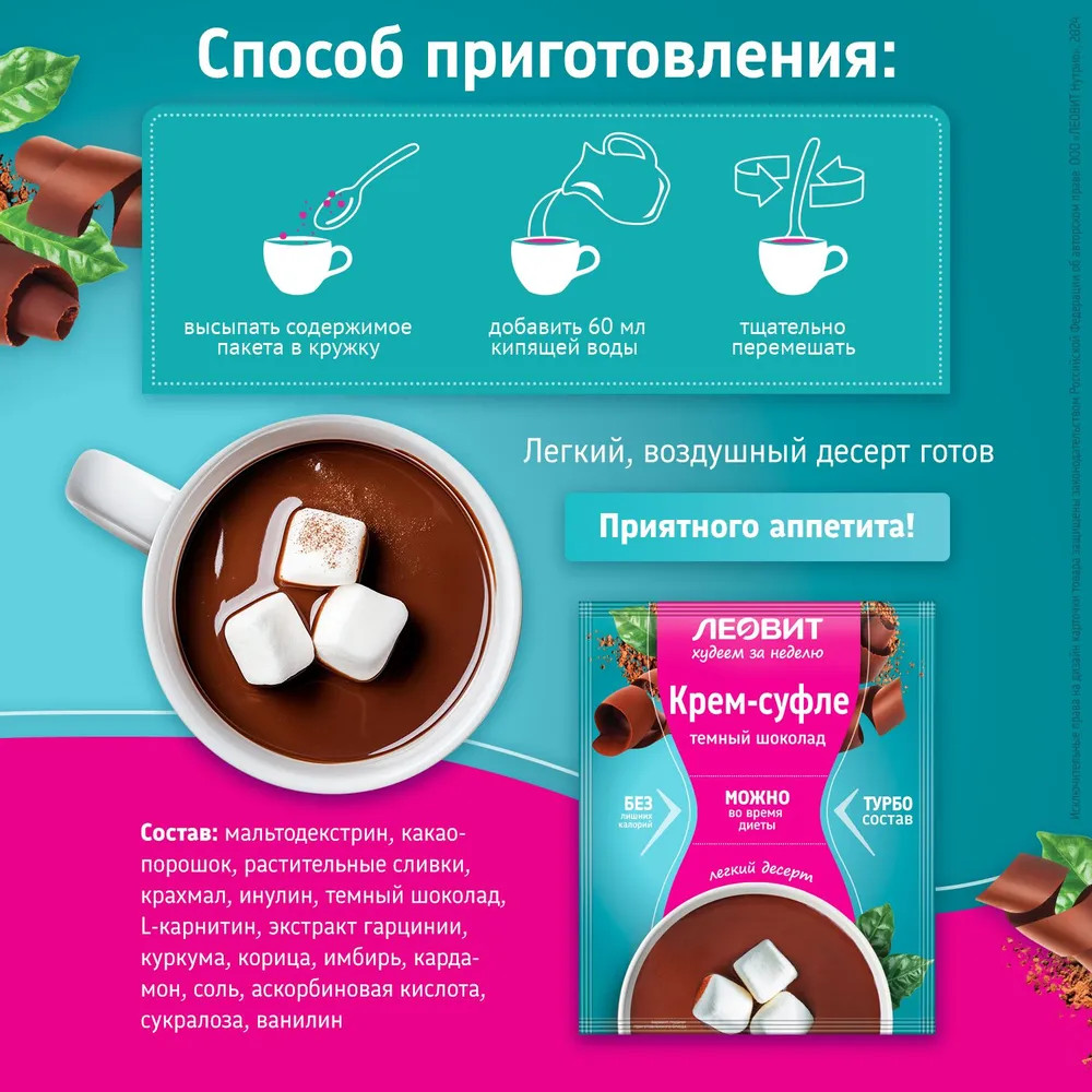 Крем-суфле «Темный шоколад» от Леовит Худеем за неделю — это идеальное решение для всех, кто ценит свое время и заботится о своем здоровье. Уникальный десерт, который можно во время диеты. Крем суфле легко готовится, благодаря чему можно насладиться великолепным десертом в любое время. Благодаря уникальному составу, этот крем-суфле не содержит усилителей вкуса, что делает его идеальным выбором для тех, кто следит за своим питанием.