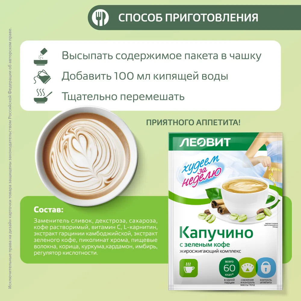 Худеем за неделю Кофе для похудения «Капучино с зелёным кофе»В данный момент этот товар отсутствует в продаже. Возможно, у нас найдется аналогичный или похожий товар здесь. офе для похудения от Леовит быстрого приготовления поможет в достижение желаемой стройности. Наш растворимый капучино с жиросжигающим комплексом в пакетиках — ваш верный спутник на пути к идеальной фигуре. Каждая чашка нашего капучино содержит уникальный сбалансированный состав, который зарекомендовал себя как эффективный жиросжигатель, способствующий активному похудению. Вы получите не только удовольствие от великолепного вкуса, но и активацию вашего обмена веществ, помощь в контроле и снижении аппетита, уменьшении чувства голода и регулировании жирового обмена благодаря входящим в состав функциональным компонентам: l карнитину, гарцинии камбоджийской, инулину и пиколинату хрома для похудения. Также важной составляющей капучино являются ароматные пряности, такие как корица, куркума, кардамон и имбирь, помогающие придерживаться правильного питания. Корица помогает стабилизации уровня сахара в крови, помогает контролировать аппетит и уменьшает чувство голода. Имбирь и кардамон способствуют улучшению пищеварения и обмена веществ, помогают в усвоении пищи. Куркума способствует снижению уровня аппетита, помогают сжигать жиры и улучшают работу кишечника. Эффективность продукта доказана клинически. |