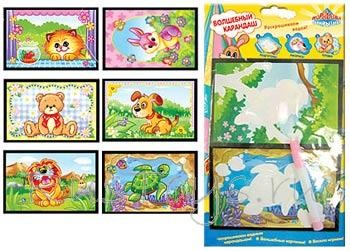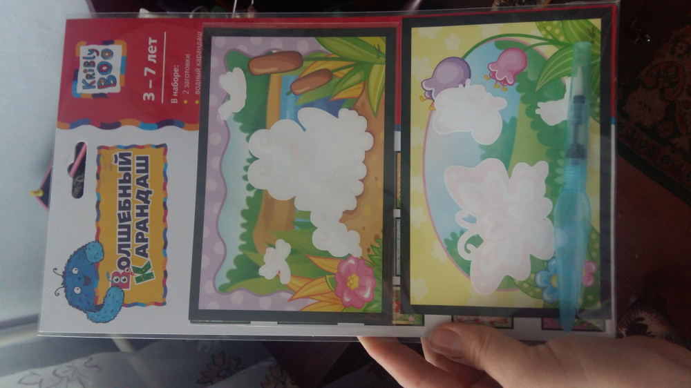 Картинки, я считаю, мелковаты, размер альбомного листа свернутого вчетверо. Развернуться негде. Рисунок получается не яркий, бледный. Но вот карандаш!!!! Он заправляется водой, скорее, это заостренная жесткая кисточка. Очень удобный, им можно раскрашивать и другие водные раскраски. Поэтому есть смысл взять ради самого карандаша.