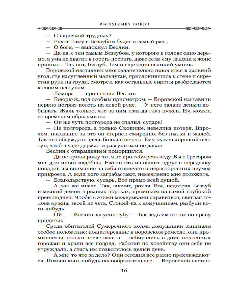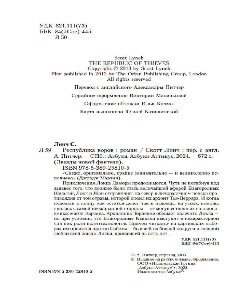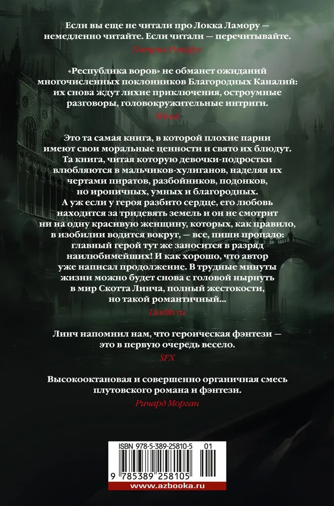 Республика воровВ данный момент этот товар отсутствует в продаже. Возможно, у нас найдется аналогичный или похожий товар здесь. Серия: Звезды новой фэнтези «Свежо, оригинально, крайне занимательно — и великолепно исполнено» (Джордж Мартин). Приключения Локка Ламоры продолжаются. Чуть не погибнув под занавес того, что должно было стать величайшей аферой Благородных Каналий, Локк и Жан отправились на север в лихорадочном поиске противоядия от той отравы, которой опоил их архонт Тал-Веррара. И когда подошли к концу как остатки денег, так и надежды на успех, помощь явилась с самой неожиданной стороны — от могущественных вольнонаемных магов Картена. Архидонна Терпение обещает излечить Локка — но при условии, что Благородные Канальи выступят в нехарактерной для них роли политтехнологов. Причем «играть» на картенских выборах им придется против Сабеты — бывшей их боевой подруги и главной любви всей жизни Локка, пропавшей на пять лет… |