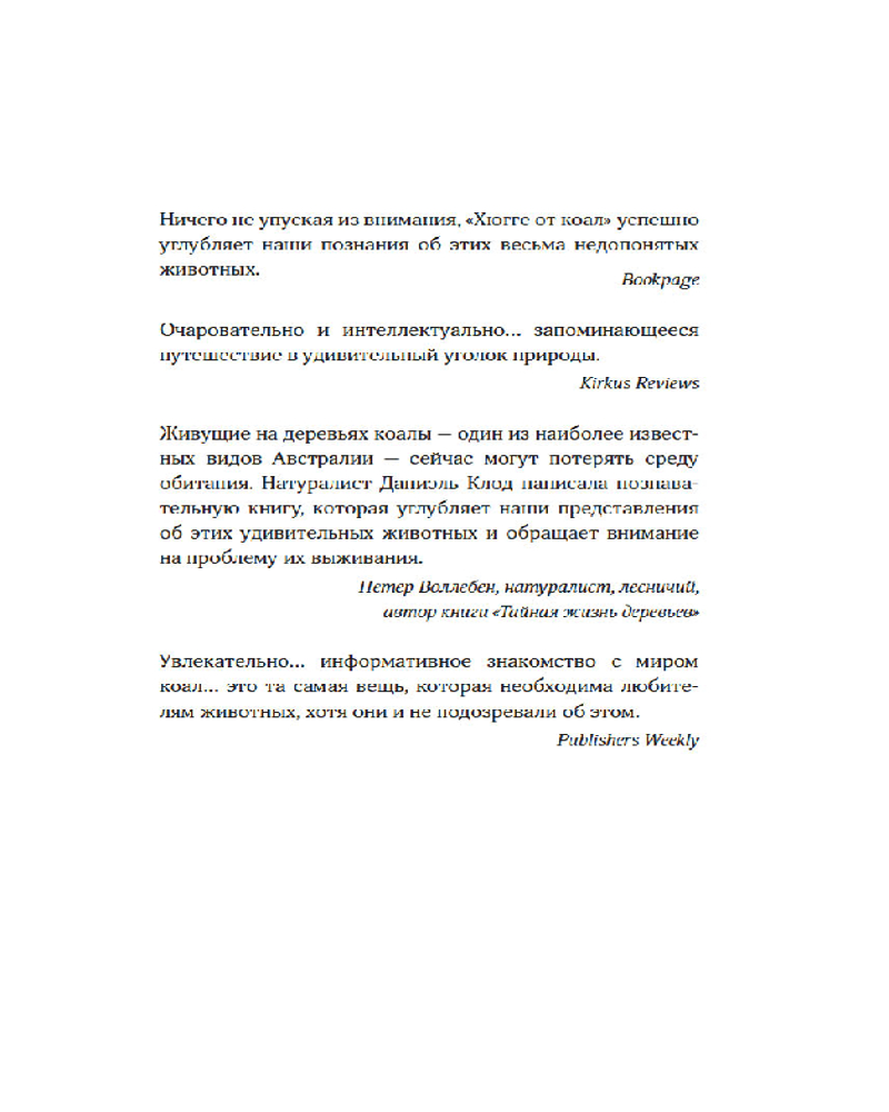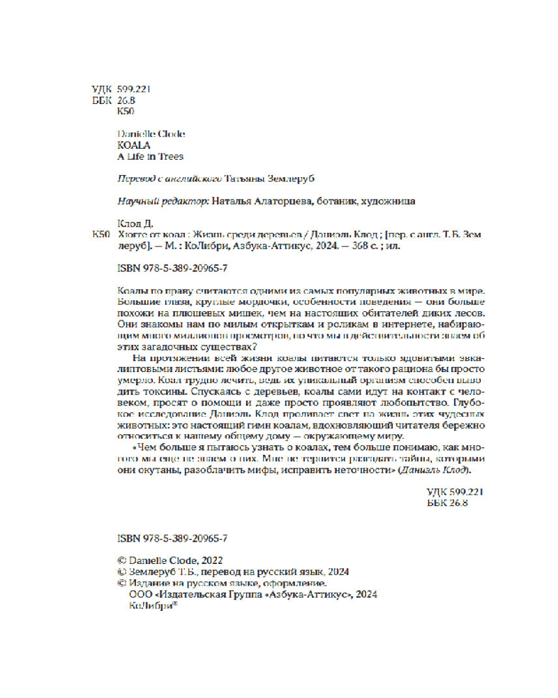 💳 Оплатить за товар можно при получении 🇰🇿 Есть бесплатная доставка по Казахстану от 1 дня 🎁 Копите бонусы с каждой покупки Серия: Новый натуралист Коалы по праву считаются одними из самых популярных животных в мире. Большие глаза, круглые мордочки, особенности поведения — они больше похожи на плюшевых мишек, чем на настоящих обитателей диких лесов. Они знакомы нам по милым открыткам и роликам в интернете, набирающим много миллионов просмотров, но что мы в действительности знаем об этих загадочных существах? На протяжении всей жизни коалы питаются только ядовитыми эвкалиптовыми листьями: любое другое животное от такого рациона бы просто умерло. Коал трудно лечить, ведь их уникальный организм способен выводить токсины. Спускаясь с деревьев, коалы сами идут на контакт с человеком, просят о помощи и даже просто проявляют любопытство. Глубокое исследование Даниэль Клод проливает свет на жизнь этих чудесных животных: это настоящий гимн коалам, вдохновляющий читателя бережно относиться к нашему общему дому — окружающему миру. |