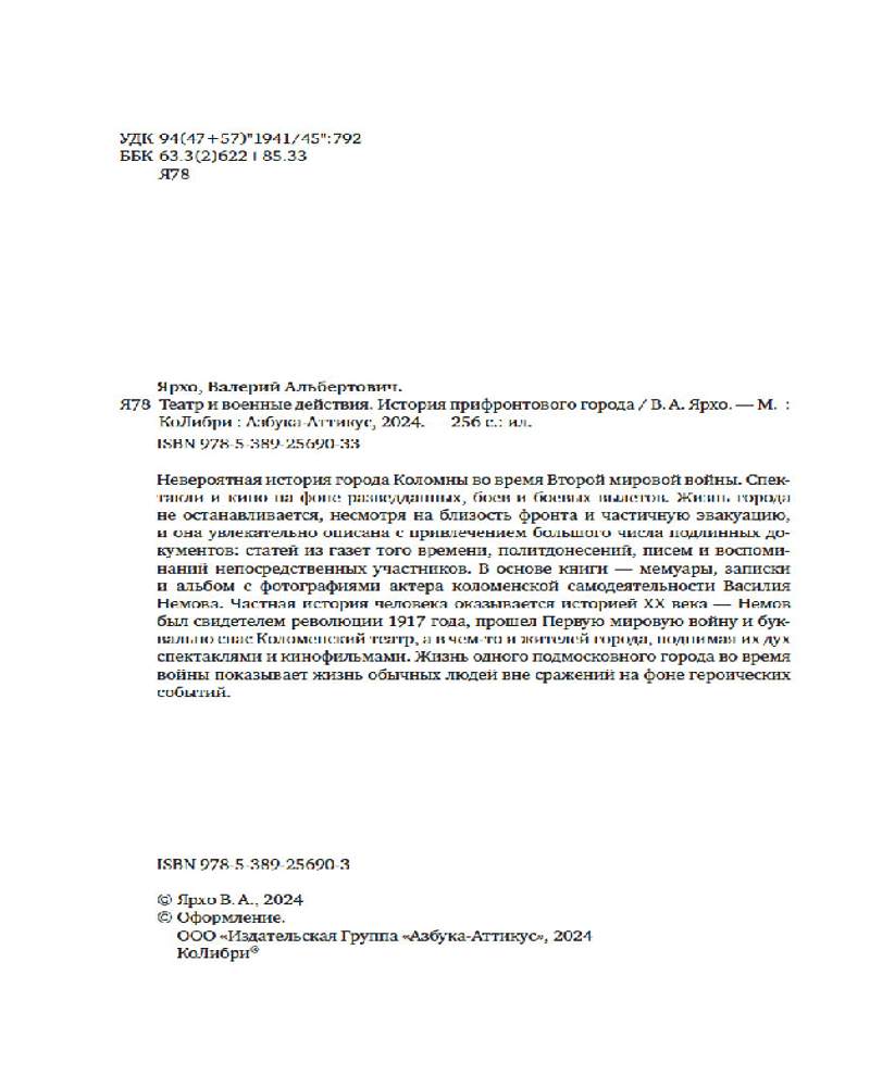 💳 Оплатить за товар можно при получении 🇰🇿 Есть бесплатная доставка по Казахстану от 1 дня 🎁 Копите бонусы с каждой покупки Серия: Исторический интерес Невероятная история города Коломны во время Второй мировой войны. Спектакли и кино на фоне разведданных, боев и боевых вылетов. Жизнь города не останавливается, несмотря на близость фронта и частичную эвакуацию, и она увлекательно описана с привлечением большого числа подлинных документов: статей из газет того времени, политдонесений, писем и воспоминаний непосредственных участников. В основе книги — мемуары, записки и альбом с фотографиями актера коломенской самодеятельности Василия Немова. Частная история человека оказывается историей ХХ века — Немов был свидетелем революции 1917 года, прошел Первую мировую войну и буквально спас Коломенский театр, а в чем-то и жителей города, поднимая их дух спектаклями и кинофильмами. Жизнь одного подмосковного города во время войны показывает жизнь обычных людей вне сражений на фоне героических событий. |