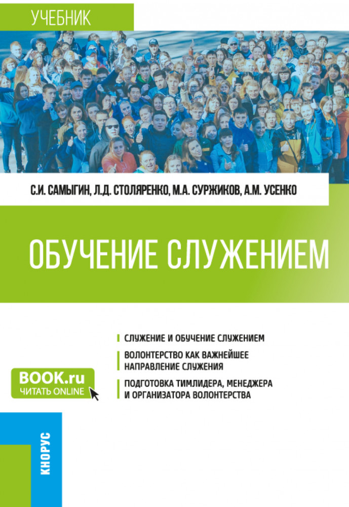 Обучение служением. УчебникСергей Иванович Самыгин, Людмила Дмитриевна Столяренко В данный момент этот товар отсутствует в продаже. Возможно, у нас найдется аналогичный или похожий товар здесь. Серия: Бакалавриат Рассматриваются понятия «служение», «обучение служением», зарубежный и российский опыт развития волонтерской деятельности, ее различные направления, программы подготовки волонтеров, тимлидеров, менеджеров, организаторов, тренеров в инфраструктуре волонтерства, их необходимые компетенции, психологические закономерности общения и взаимодействия волонтеров с больными, одинокими престарелыми, инвалидами, а также психологические основы поведения и оказания помощи в чрезвычайных ситуациях, социально-психологические закономерности лидерства и формирования команды волонтеров, психо-педагогические основы обучения служением и организации тренингов командообразования. |