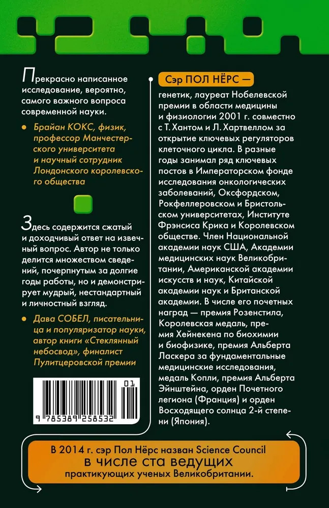 💳 Оплатить за товар можно при получении 🇰🇿 Есть бесплатная доставка по Казахстану от 1 дня 🎁 Копите бонусы с каждой покупки Серия: Научный интерес Жизнь окружает нас повсюду — разнообразная и изумительная. Жизнь не сравнима ни с чем и не устает нас поражать. Но что в действительности значит быть живым? Как устроена живая клетка? С чего началась жизнь и какова природа отношений, связывающих воедино всю жизнь на нашей планете? Нобелевский лауреат сэр Пол Нёрс в области медицины и физиологии посвятил много лет исследованию этих фундаментальных проблем — от происхождения жизни до эволюции. В книге «Чудо живой клетки» он, вслед за Дарвином, Докинзом, Хокингом и Аттенборо, объясняет природу самой жизни в форме, которая будет понятна каждому читателю. В этом удивительном путешествии мы окажемся в лаборатории современного исследователя, узнаем историю биологии и ее основные концепции и начнем лучше понимать природу жизни, процессы эволюции, генетику и многое другое. «На нас лежит особая ответственность за жизнь на этой планете, которая создана такой, какая она есть, нашими родственниками, близкими и не очень. Нам нужно хорошо относиться к ней и заботиться о ней. И для этого нужно ее понимать» (сэр Пол Нёрс). Ранее книга издавалась в серии «Научный интерес» под заголовком «Что такое жизнь? Понять биологию за пять простых шагов». |
