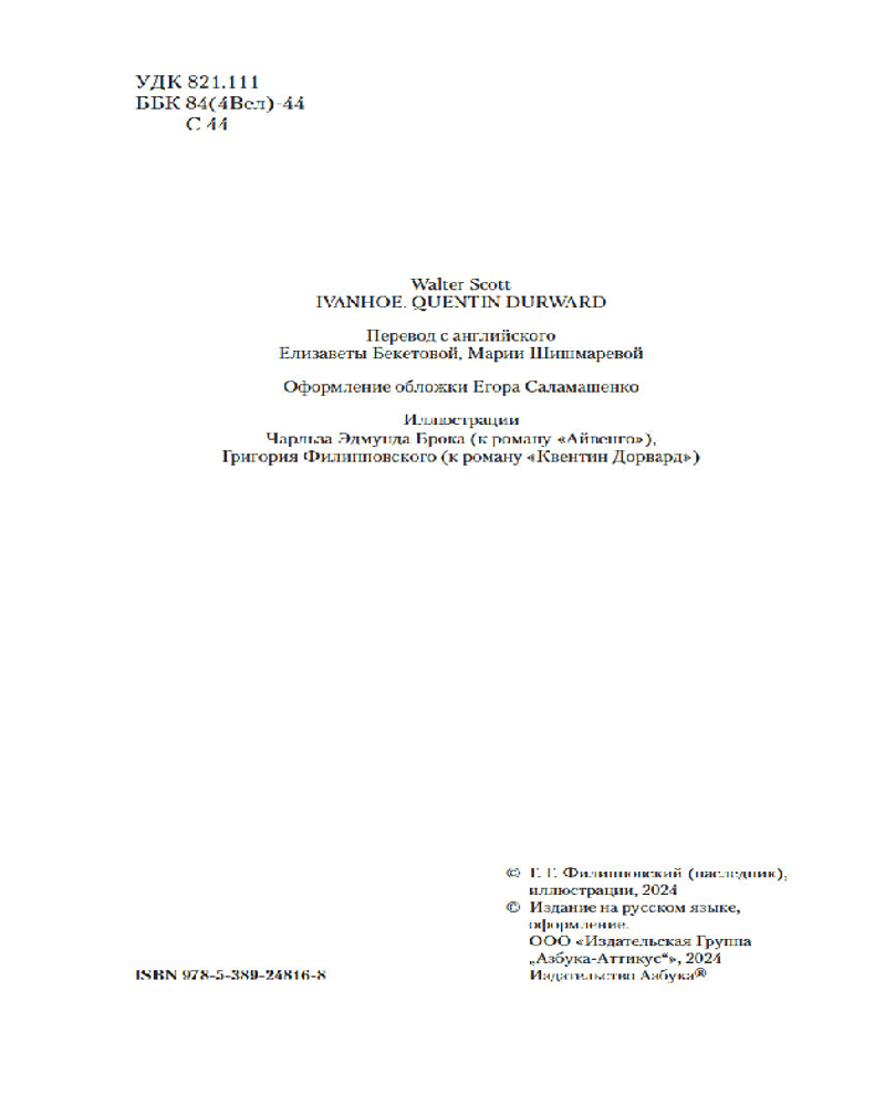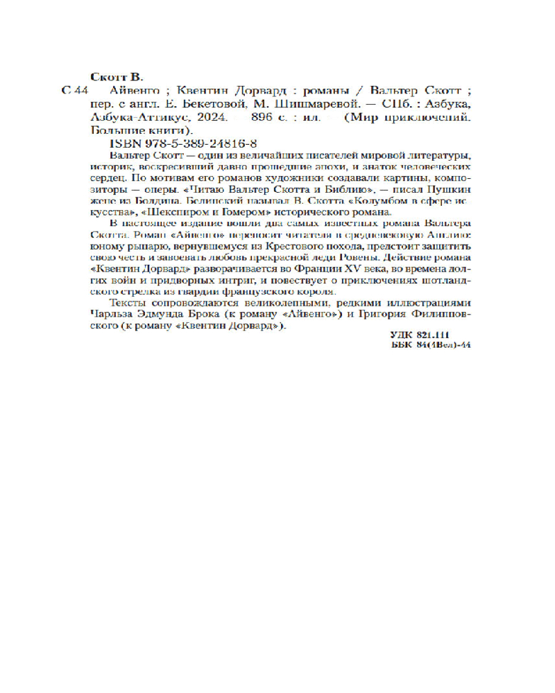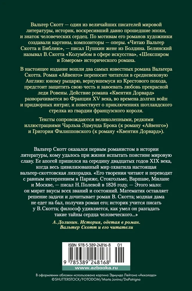 💳 Оплатить за товар можно при получении 🇰🇿 Есть бесплатная доставка по Казахстану от 1 дня 🎁 Копите бонусы с каждой покупки Серия: Мир приключений. Большие книги Вальтер Скотт — один из величайших писателей мировой литературы, историк, воскресивший давно прошедшие эпохи, и знаток человеческих сердец. По мотивам его романов художники создавали картины, композиторы — оперы. «Читаю Вальтер Скотта и Библию», — писал Пушкин жене из Болдина. Белинский называл В. Скотта «Колумбом в сфере искусства», «Шекспиром и Гомером» исторического романа. В настоящее издание вошли два самых известных романа Вальтера Скотта. Роман «Айвенго» переносит читателя в средневековую Англию: юному рыцарю, вернувшемуся из Крестового похода, предстоит защитить свою честь и завоевать любовь прекрасной леди Ровены. Действие романа «Квентин Дорвард» разворачивается во Франции XV века, во времена долгих войн и придворных интриг, и повествует о приключениях шотландского стрелка из гвардии французского короля. Тексты сопровождаются великолепными, редкими иллюстрациями Чарльза Эдмунда Брока (к роману «Айвенго») и Григория Филипповского (к роману «Квентин Дорвард»). |