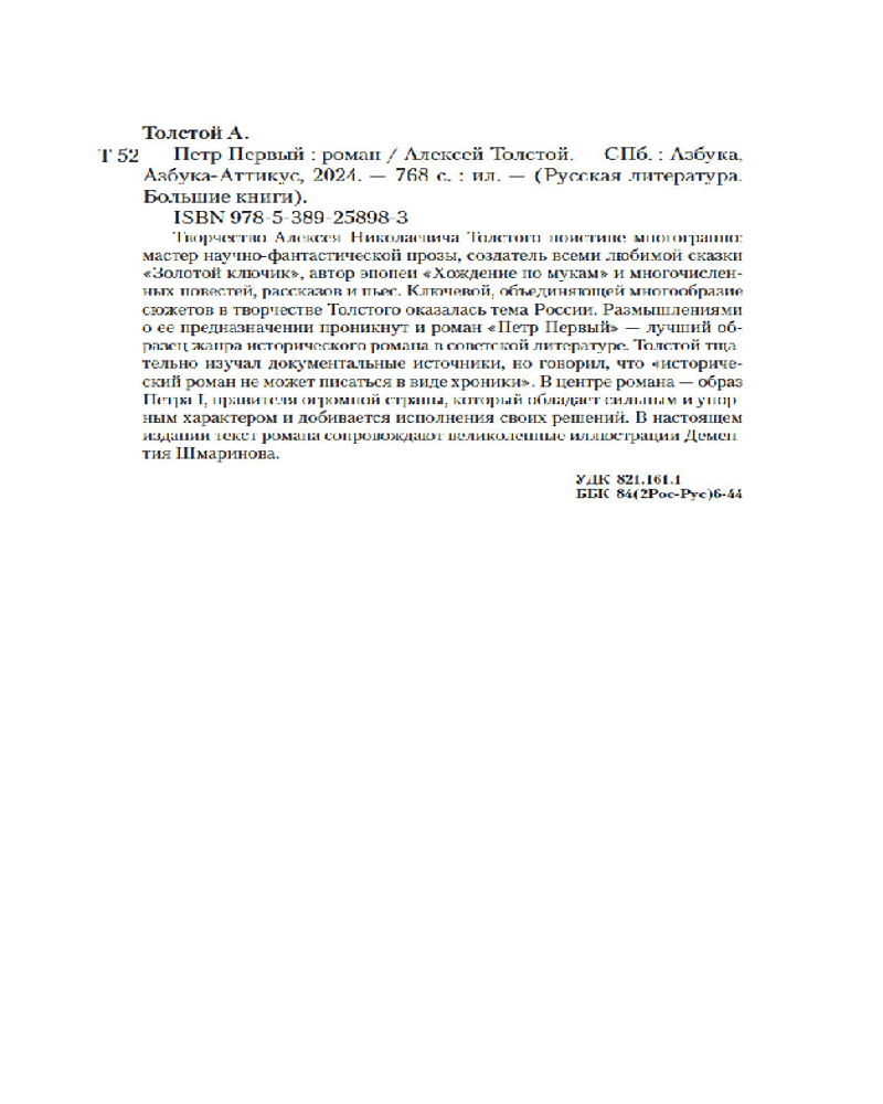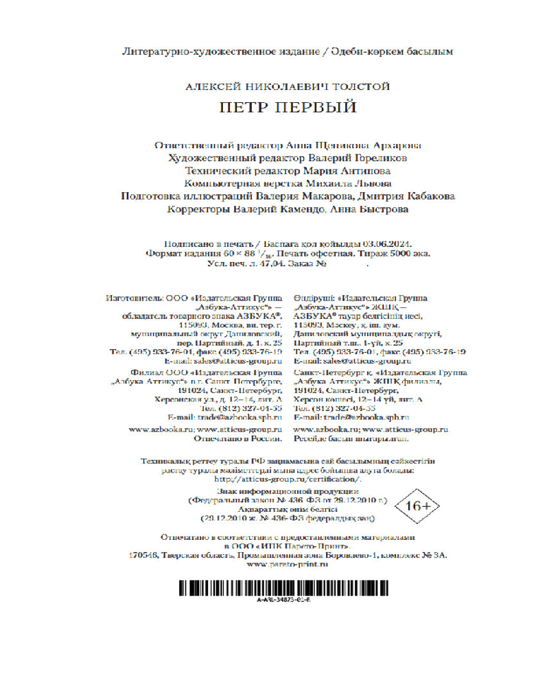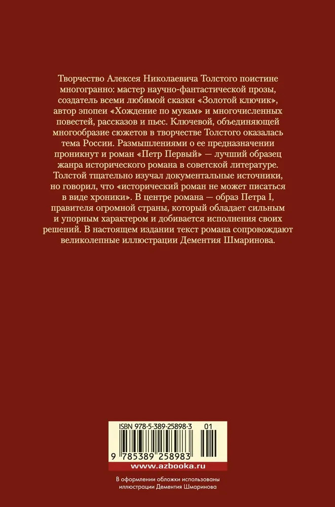 💳 Оплатить за товар можно при получении 🇰🇿 Есть бесплатная доставка по Казахстану от 1 дня 🎁 Копите бонусы с каждой покупки Серия: Русская литература. Большие книги Творчество Алексея Николаевича Толстого поистине многогранно: мастер научно-фантастической прозы, создатель всеми любимой сказки «Золотой ключик», автор эпопеи «Хождение по мукам» и многочисленных повестей, рассказов и пьес. Ключевой, объединяющей многообразие сюжетов в творчестве Толстого оказалась тема России. Размышлениями о ее предназначении проникнут и роман «Петр Первый» — лучший образец жанра исторического романа в советской литературе. Толстой тщательно изучал документальные источники, но говорил, что «исторический роман не может писаться в виде хроники». В центре романа — образ Петра I, правителя огромной страны, который обладает сильным и упорным характером и добивается исполнения своих решений. В настоящем издании текст романа сопровождают великолепные иллюстрации Дементия Шмаринова. |